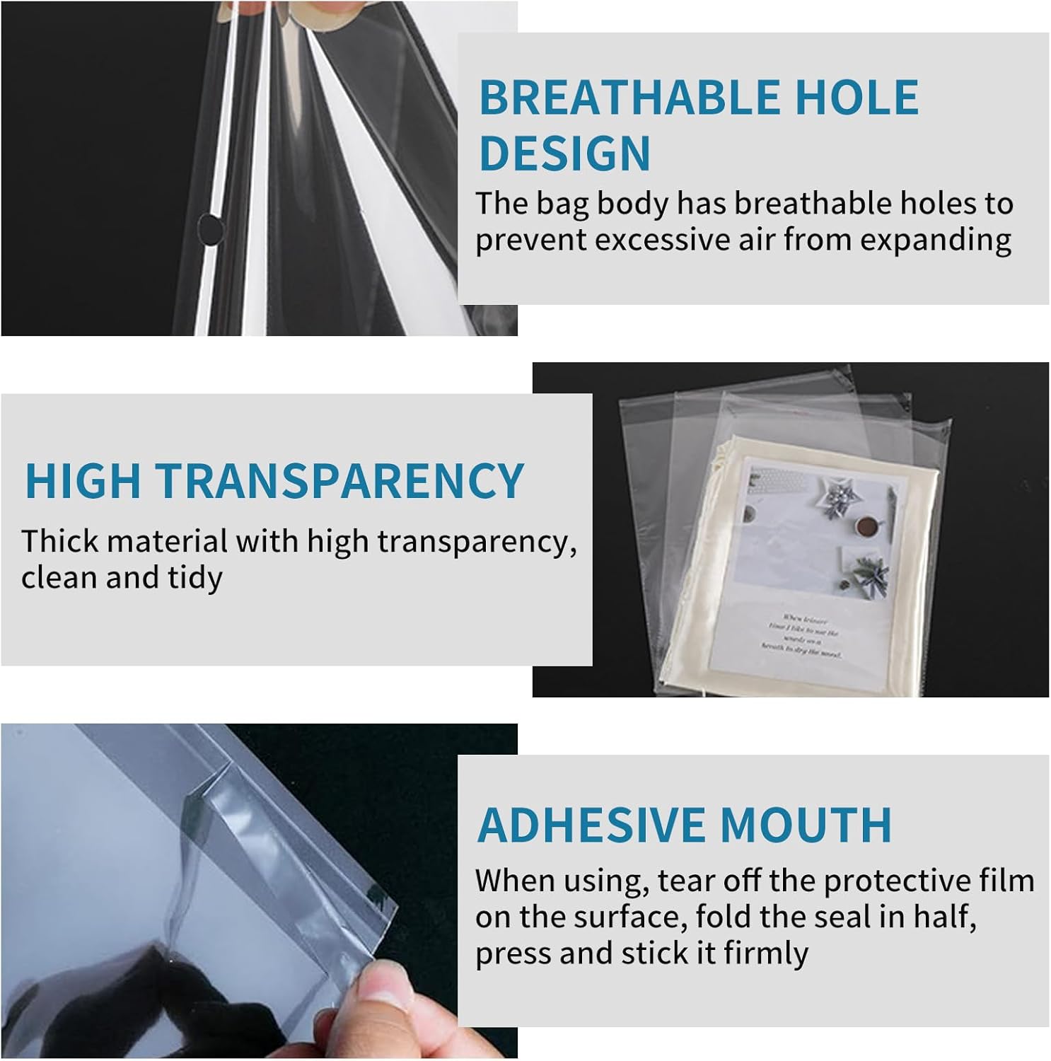 These clear self-adhesive A5 cellophane bags are perfect for packaging a variety of items, including cookies, cards, and small gifts. Made from premium 100% oriented polypropylene (OPP), they offer high transparency and durability. The bags are odor-free, non-toxic, and resistant to tearing, making them suitable for daily use. Their resealable design features an easy one-touch seal, allowing for quick opening and closing. This ensures that your items remain protected from moisture and dust.