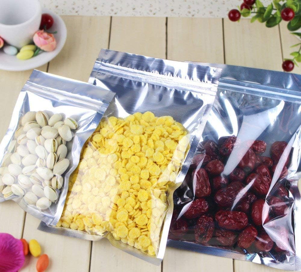 The pouches are made from clear front aluminum foil Mylar, which is durable and suitable for food storage.