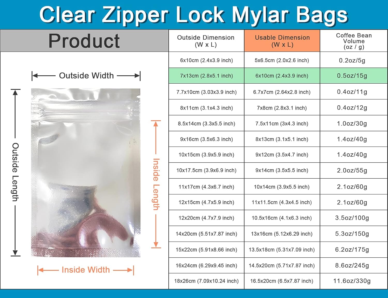 The Mylar pouch measures 7x13cm (2.8x5.1 inches) with an inner size of 2.4x3.9 inches.