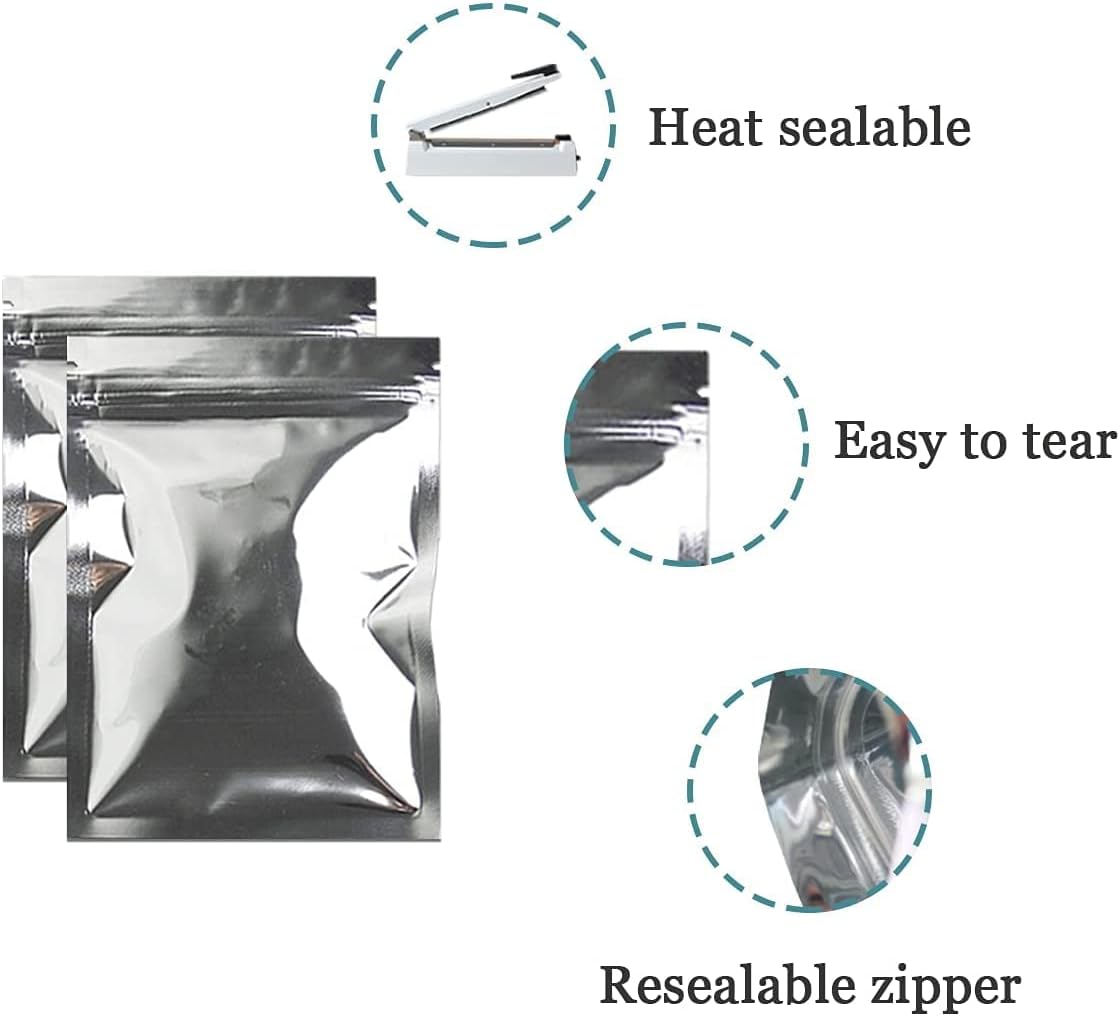 100pcs 9×14 cm (3.5×5.5 inch) Mylar Foil Bags Zipper Lock Candy Food Storage Packaging Silver Reclosable Aluminium Foil Smell Proof Packing Pouch for Zip Bag Reusable Lock Seal