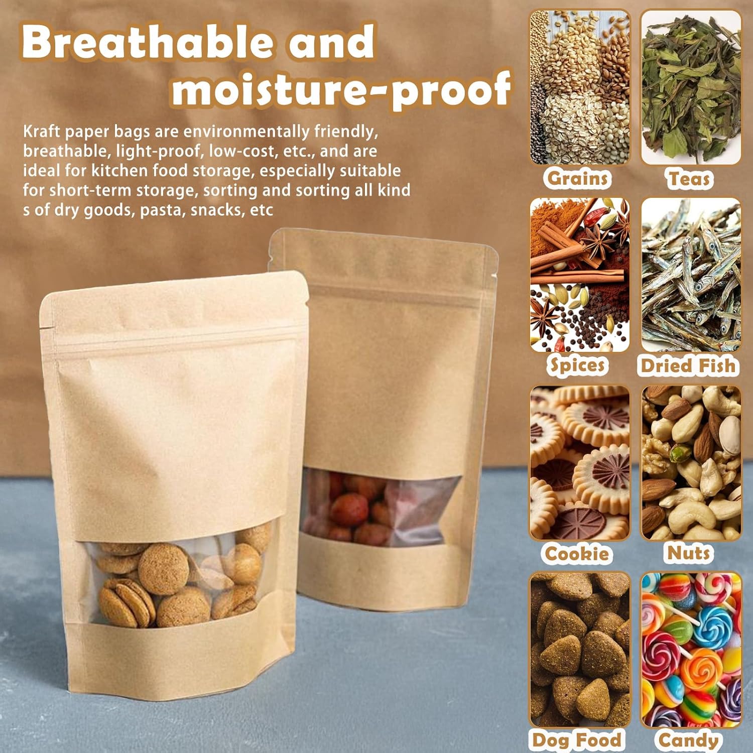 100Pcs Kraft Bags With Window,14 * 20+4cm Kraft Sealable Pouches,Small Brown Sweet Pouches,Resealable Paper Food Storage Bags for Coffee Beans,Nuts,Snacks,Tea Leaves, Spices