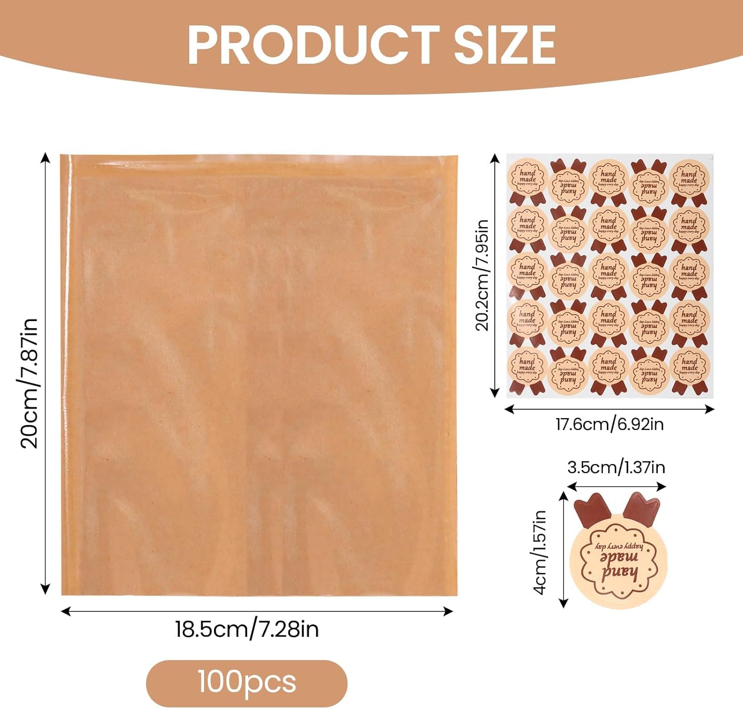 100Pcs Kraft Paper Sandwich Bags Reusable Food Lunch Bags Heat Sealable Toast Packs with Front Clear Cellophane Paper Window to Display Sweets Cookies Snacks Baking Packaging with Stickers (20 x 15cm)