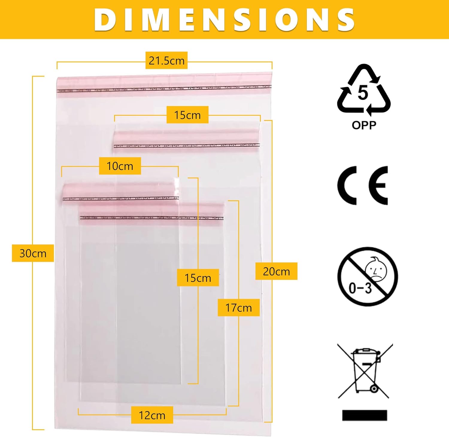 OliveBird's 100pcs Self Adhesive Bags are designed for versatility in packaging. These transparent cellophane bags, measuring 15cm x 20cm with a 3cm flap, are ideal for various uses. Made from high-quality polypropylene, they provide excellent clarity and durability, ensuring your items are well-presented. The self-sealing feature makes them easy to use, while their moisture-resistant properties help preserve the freshness of contents.
