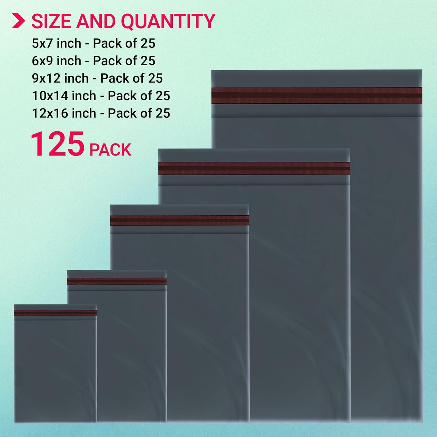 125 Mixed Grey Parcel Bags, Tamper-Proof Strong Postal Packaging Bags for Shipping, Mailing & Delivery, 5 Sizes Small to Large, 25 Each