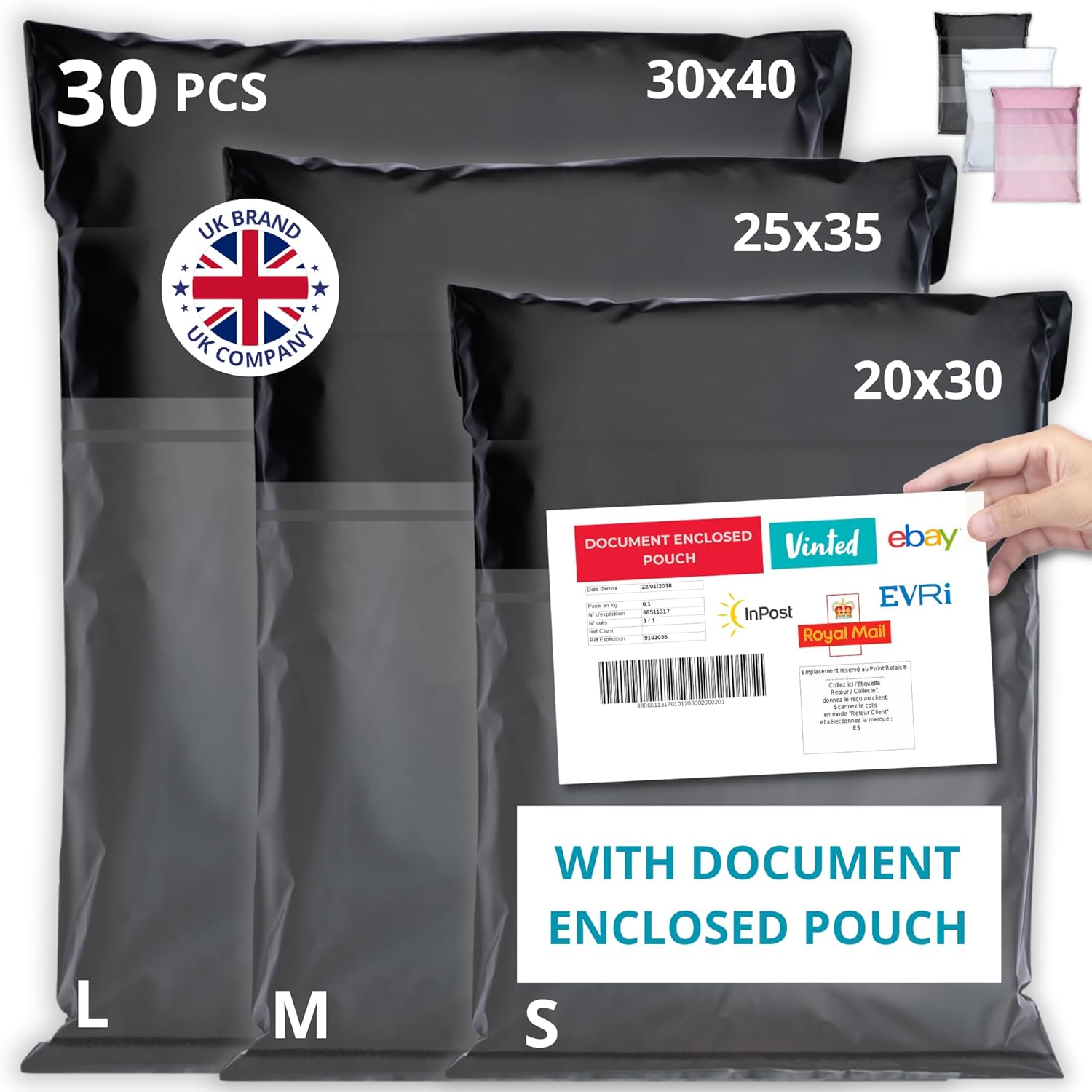 30 Postage Bags for Clothes Vinted with Label Pouch – 3 Sizes S/M/L – Waterproof, Tear-Proof Plastic Mailing Parcel Bags – Strong Durable Self-Seal Shipping Packaging for Online Sellers & Vinted Users