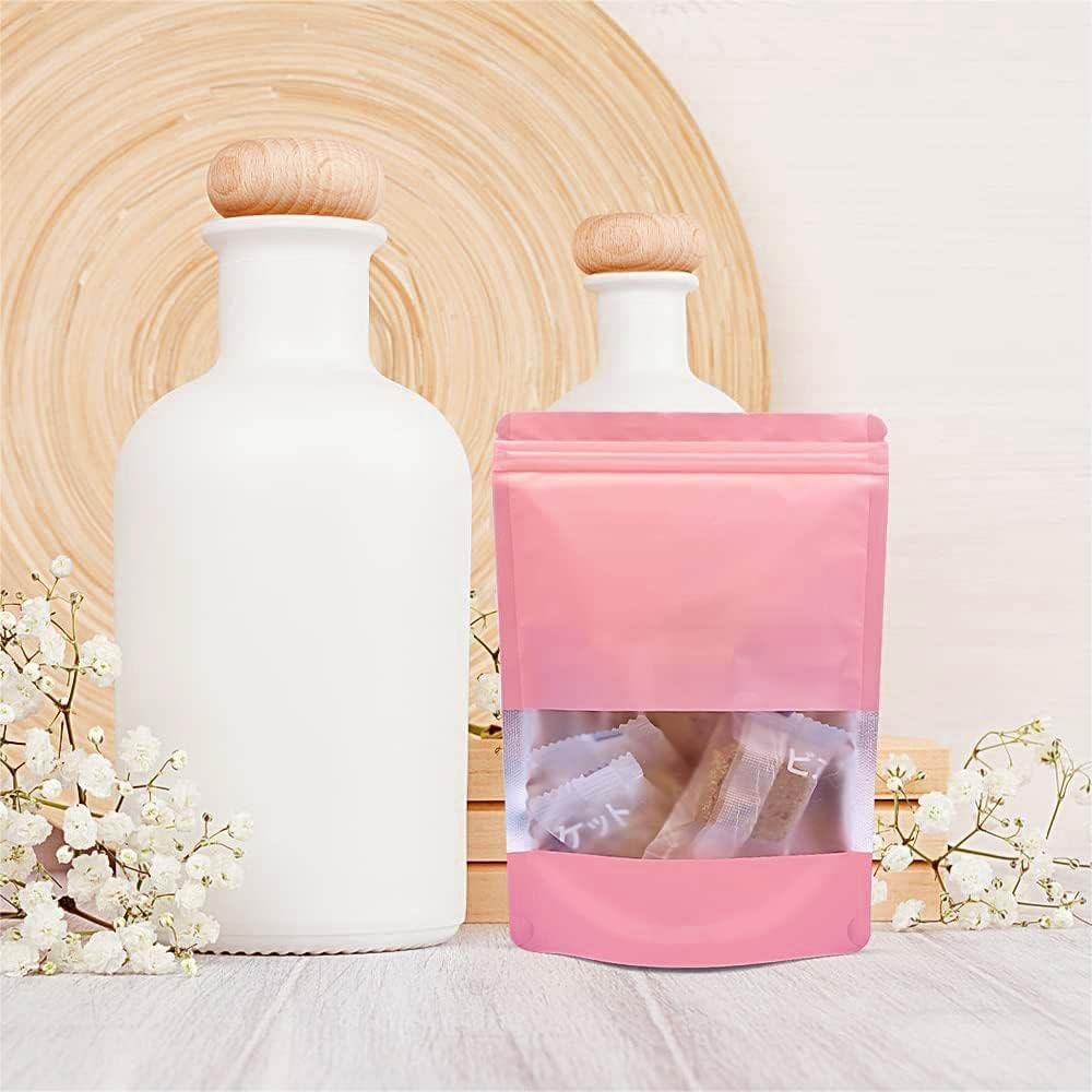 30pcs Stand up Mylar Ziplock Bags with Clear Window,10x15cm Frosted Pink Resealable Plastic Pouches for Kitchen Storage Jewellery Sweets
