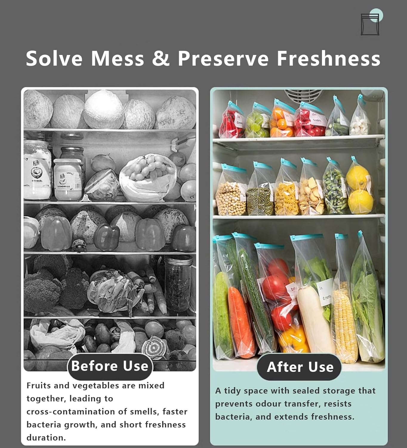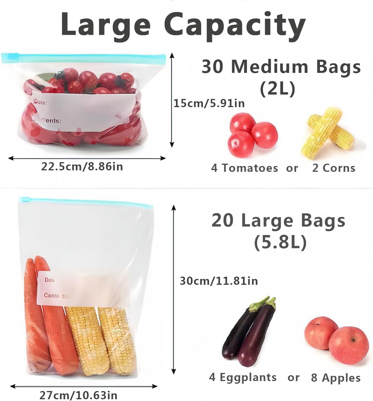 With a total capacity of 5.8L and 2L, these bags are perfect for both large and small storage needs. They feature a secure zip closure to keep your food fresh and prevent spills.