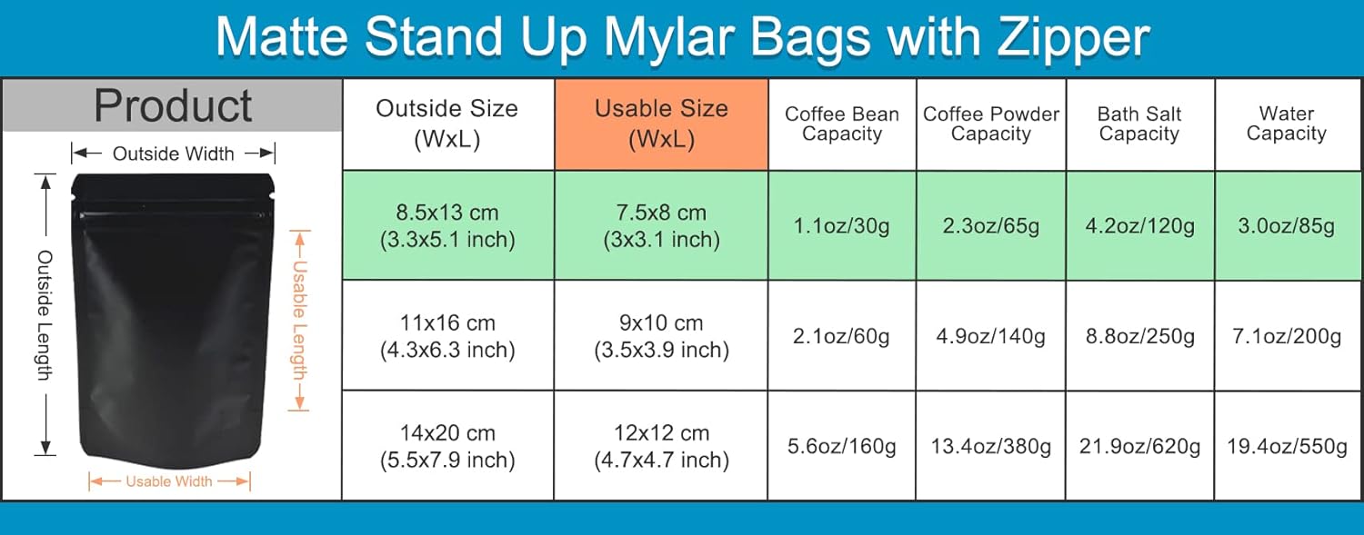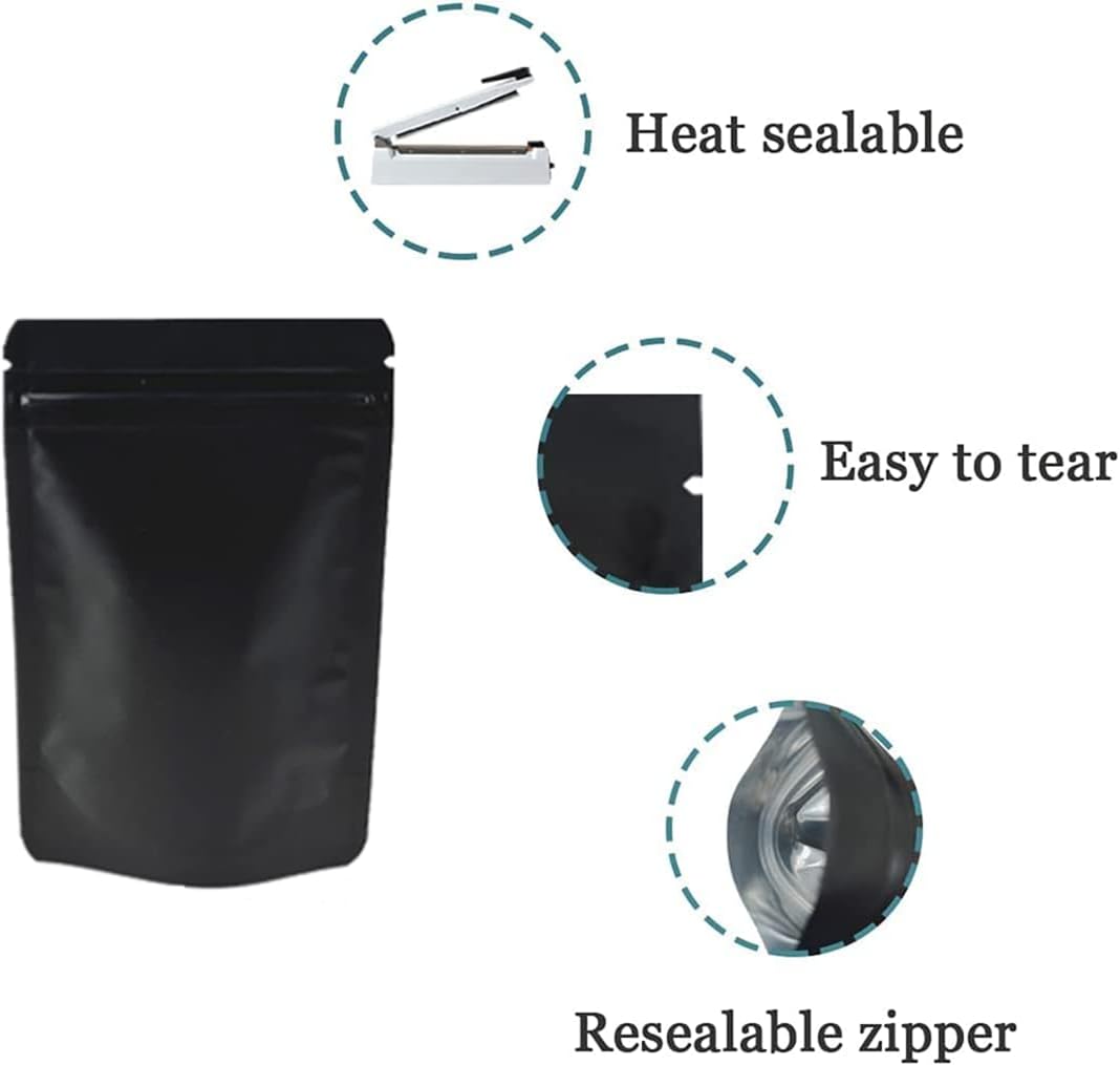 50pcs 8.5x13cm Matte Black Resealable Zipper Lock Food Storage Bags Mylar Aluminium Foil Stand Up Pouches Bags Smell Proof Heat Sealable for Zip Storing Snack Lock 3.54 Thick