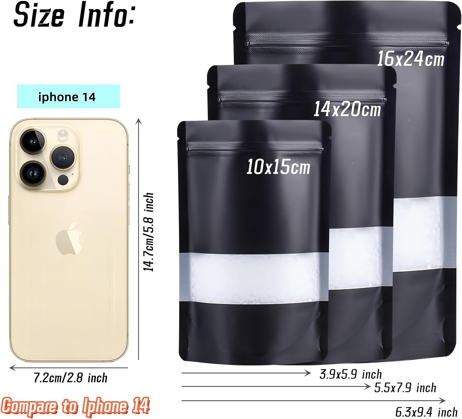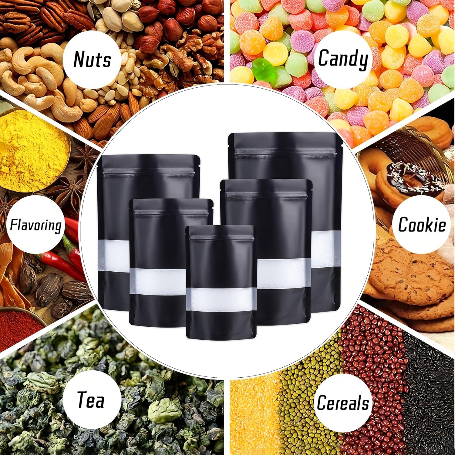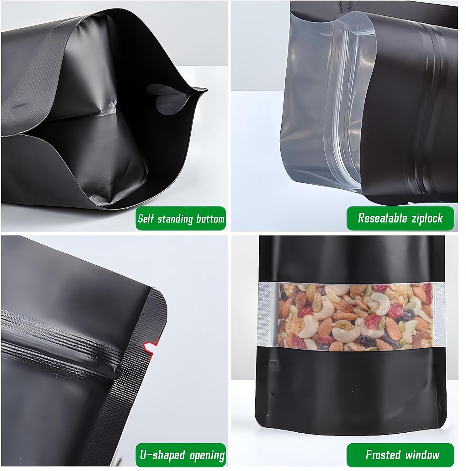 50pcs Mylar Bags With Window,Black Mylar Bags Stand Up,Smell Proof Bag Aluminum Foil Pouches,Reusable Heat Seal Baggies Packaging Bag for Food Storage (16x24cm – 50 pcs, Black)