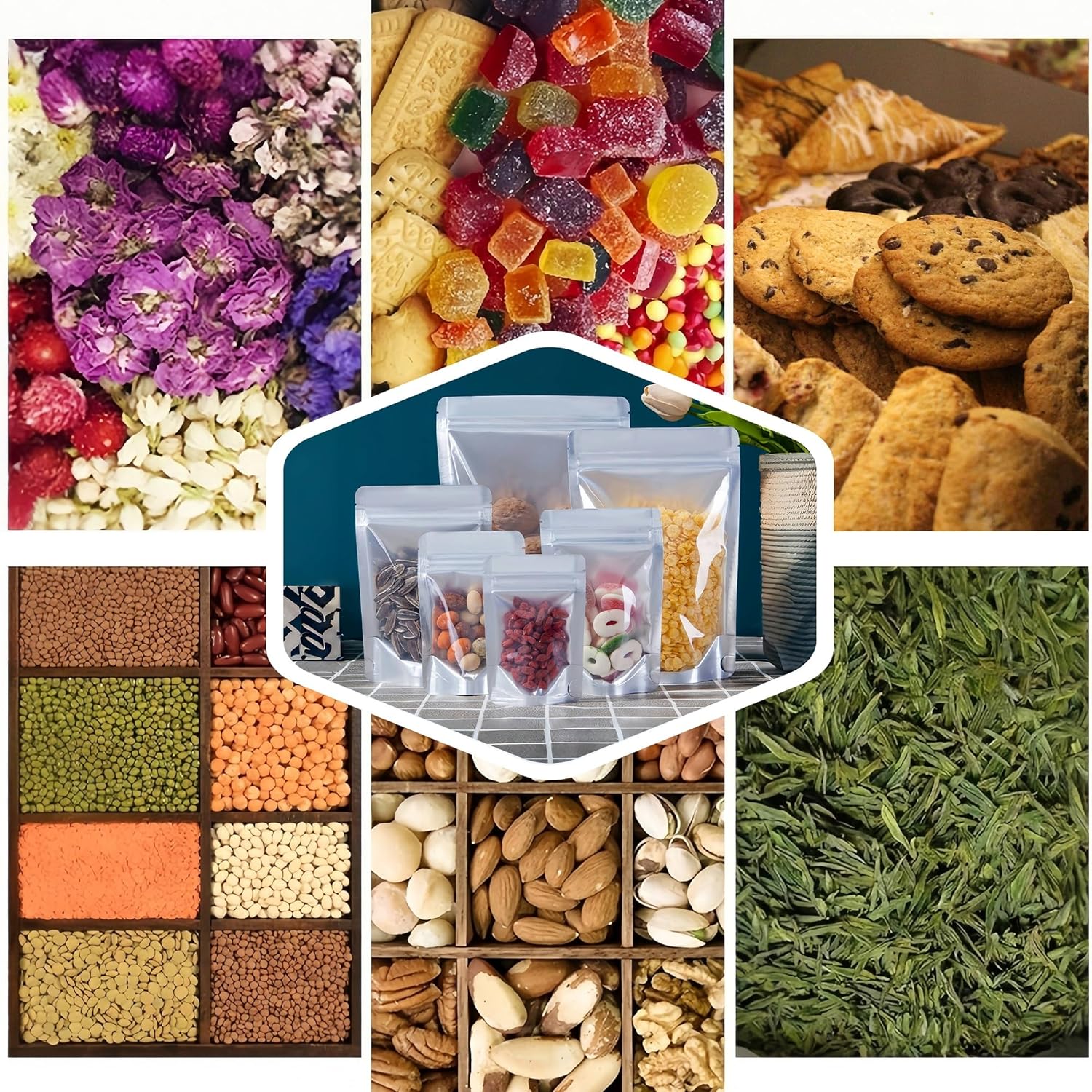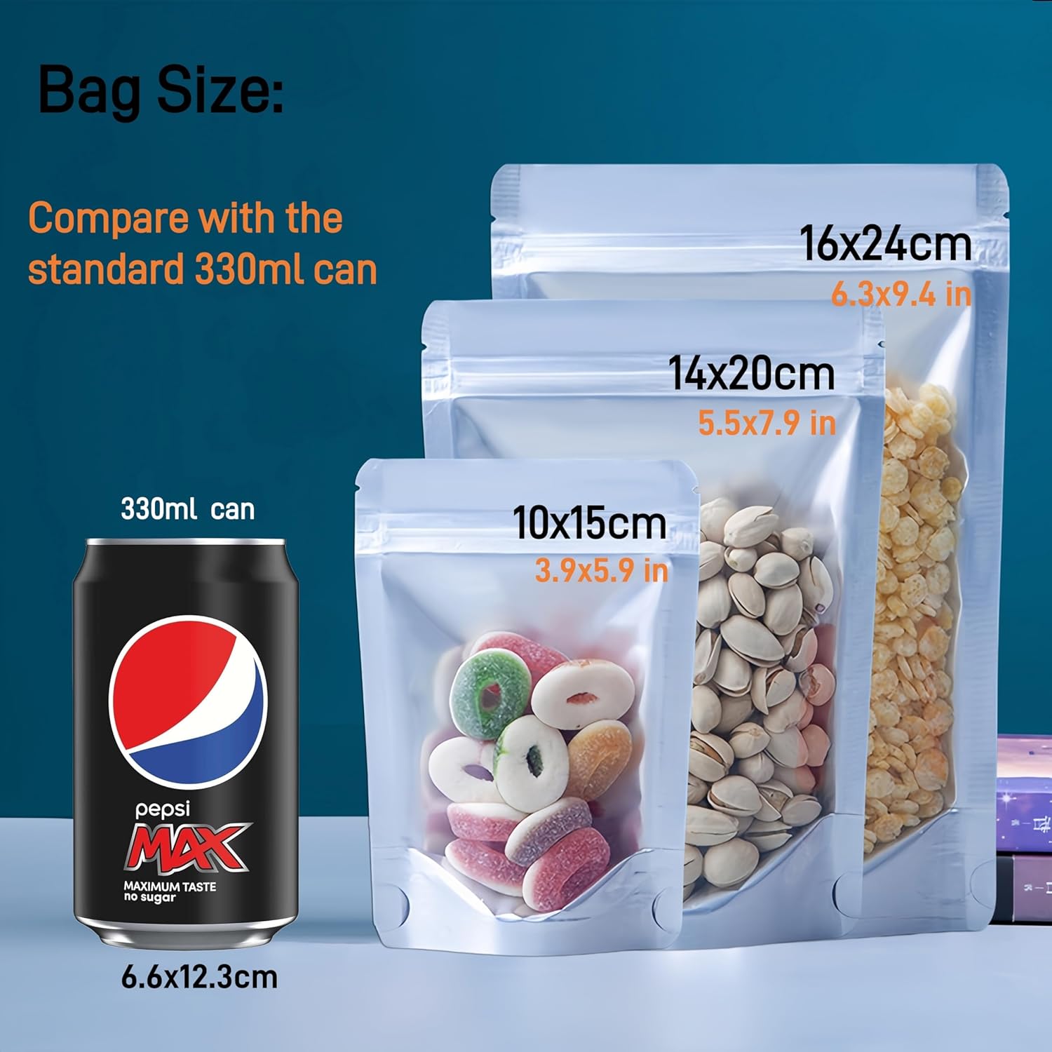 50pcs Mylar Resealable Stand Up Aluminum Foil Ziplock Bags with Clear Front, Food Bags Zip Seal, Sweet Pouches, Smell Proof, Heat Seal Packaging Baggies for Food Storage (14x20cm – 50pcs)
