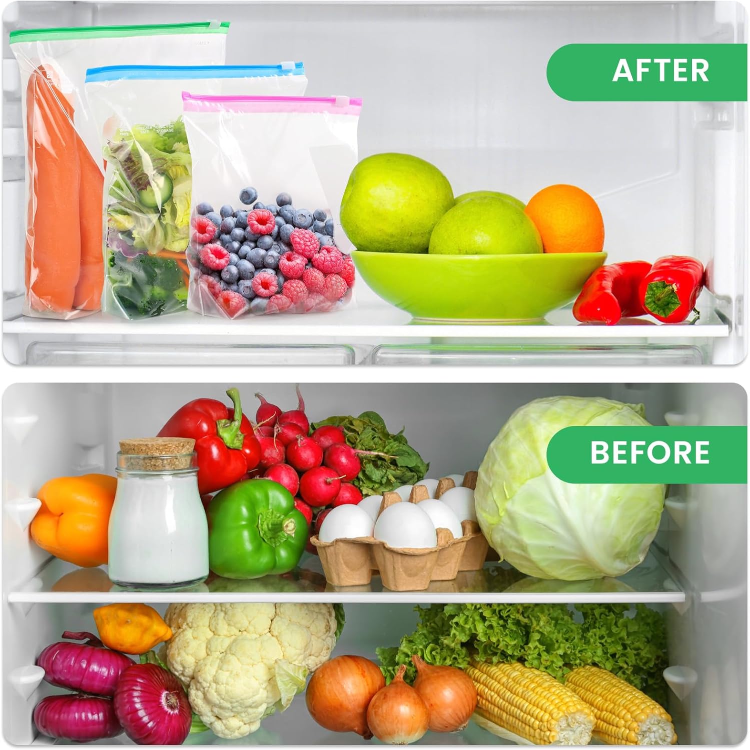 You can store a variety of foods including fruits, vegetables, grains, meat, and snacks.
