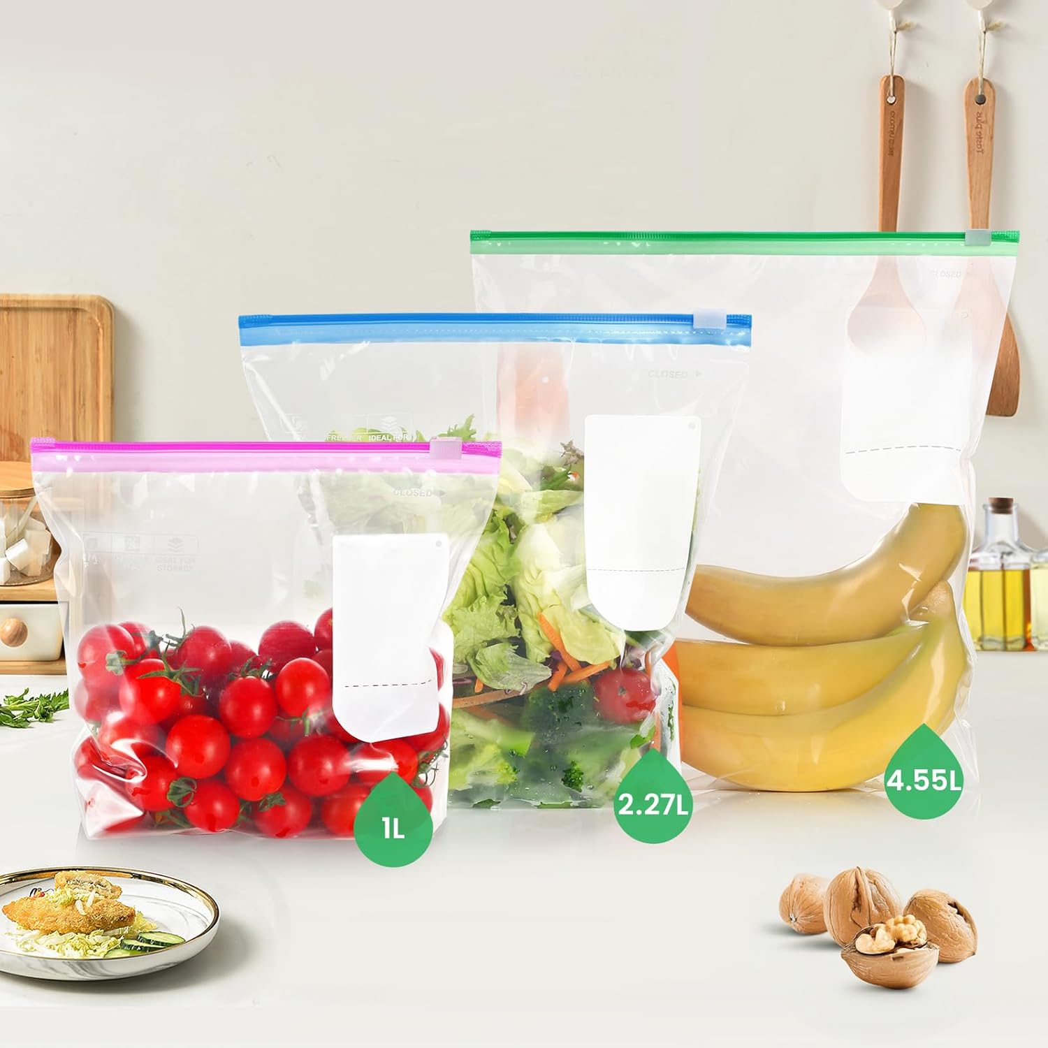 The package includes three sizes: 20 large bags (4.55L), 30 medium bags (2.27L), and 25 small bags (1L).