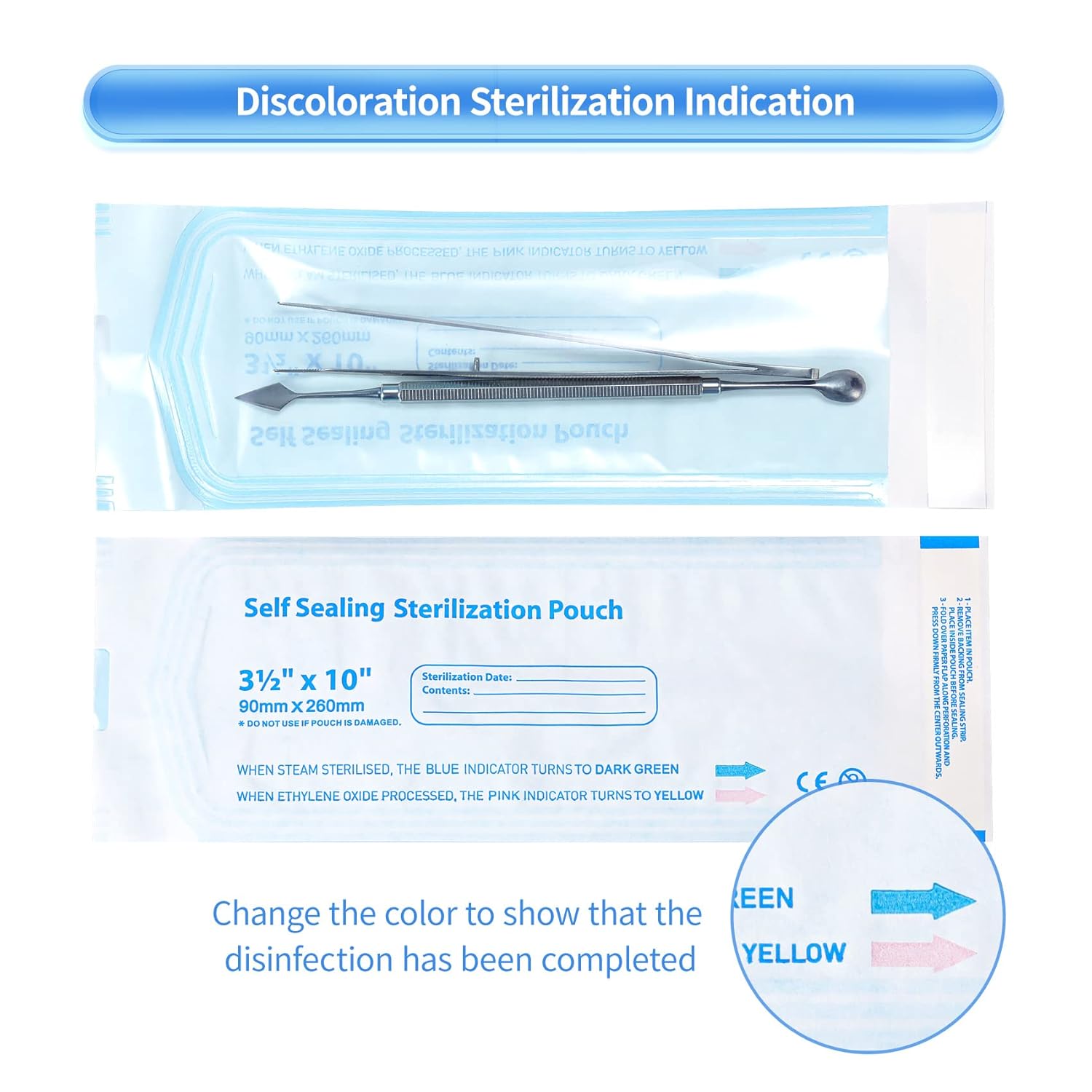 • Color change indicator from pink to yellow after sterilization