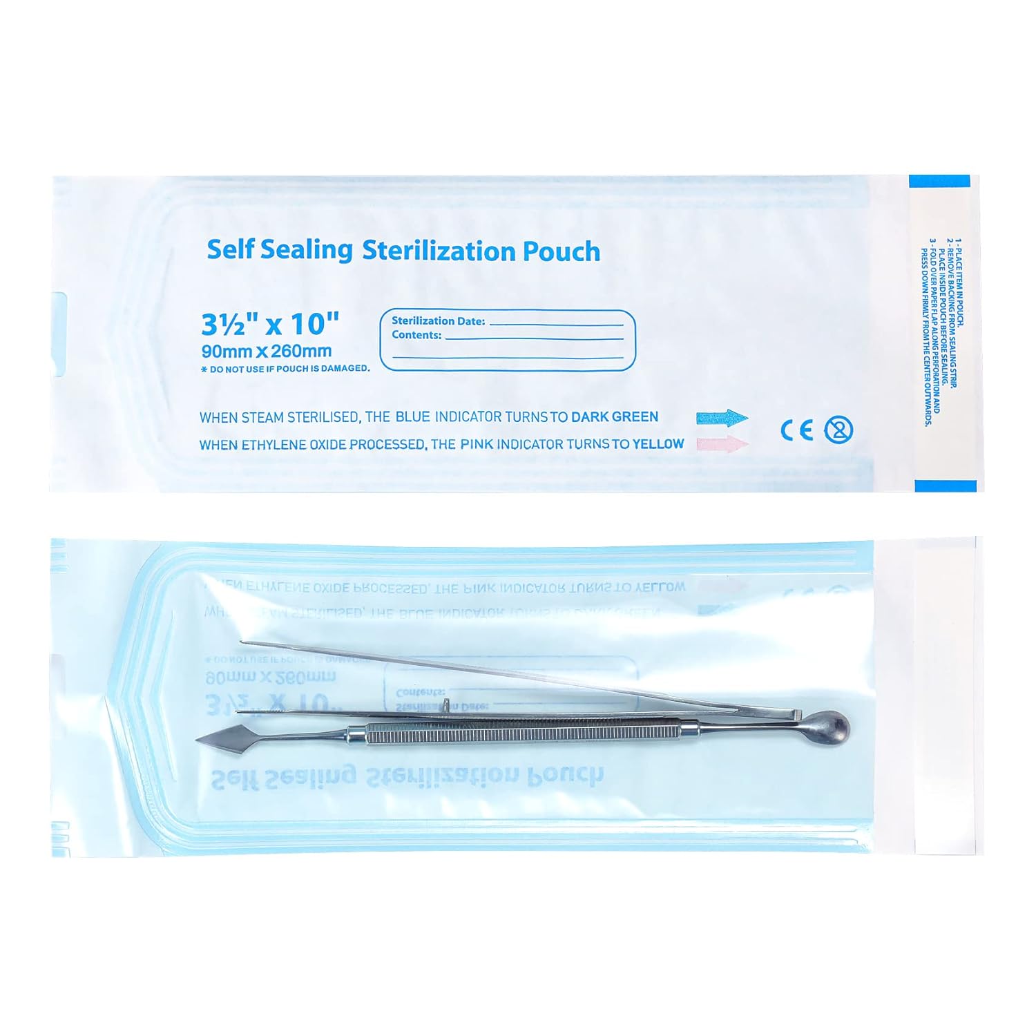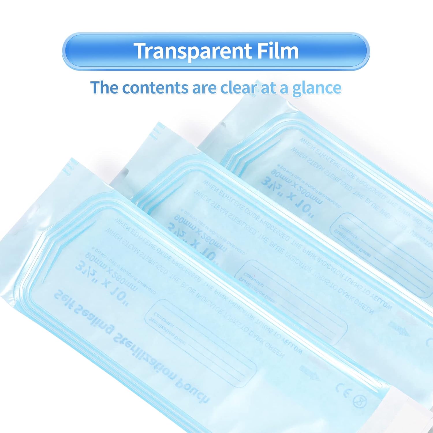 The sterilization pouches are blue with a transparent film.