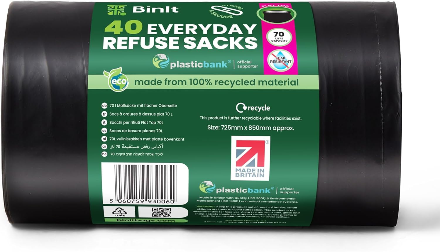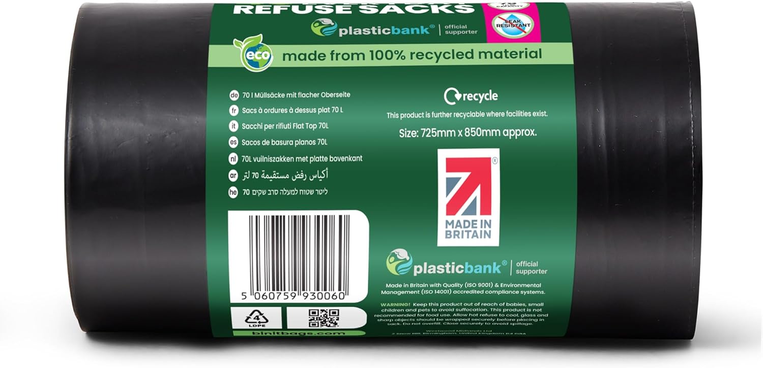 BIN IT 40 Everyday 70L Strong & Secure, Refuse Sacks, Bin Bags, Bin Liners, Flat Top, Recycled, Tear Resistant, 30 μm, Perfect for Everyday Use, Household, Office, Kitchen & Caterers