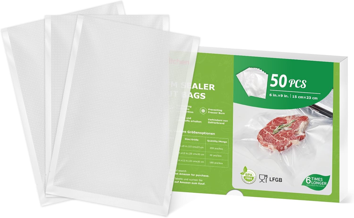 Bonsenkitchen Precut Vacuum Sealer Bags, 50 pcs 15 x 23 CM Food Sealer Bags, Food Grade, BPA Free, Heavy Duty, Customized Size, Vac, Meal Prep or Sous Vide Cooking, VB30