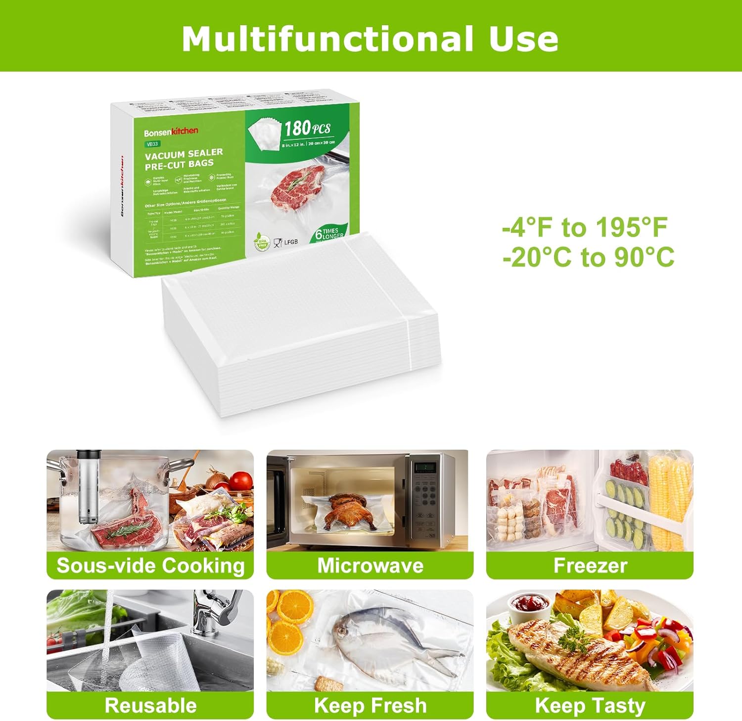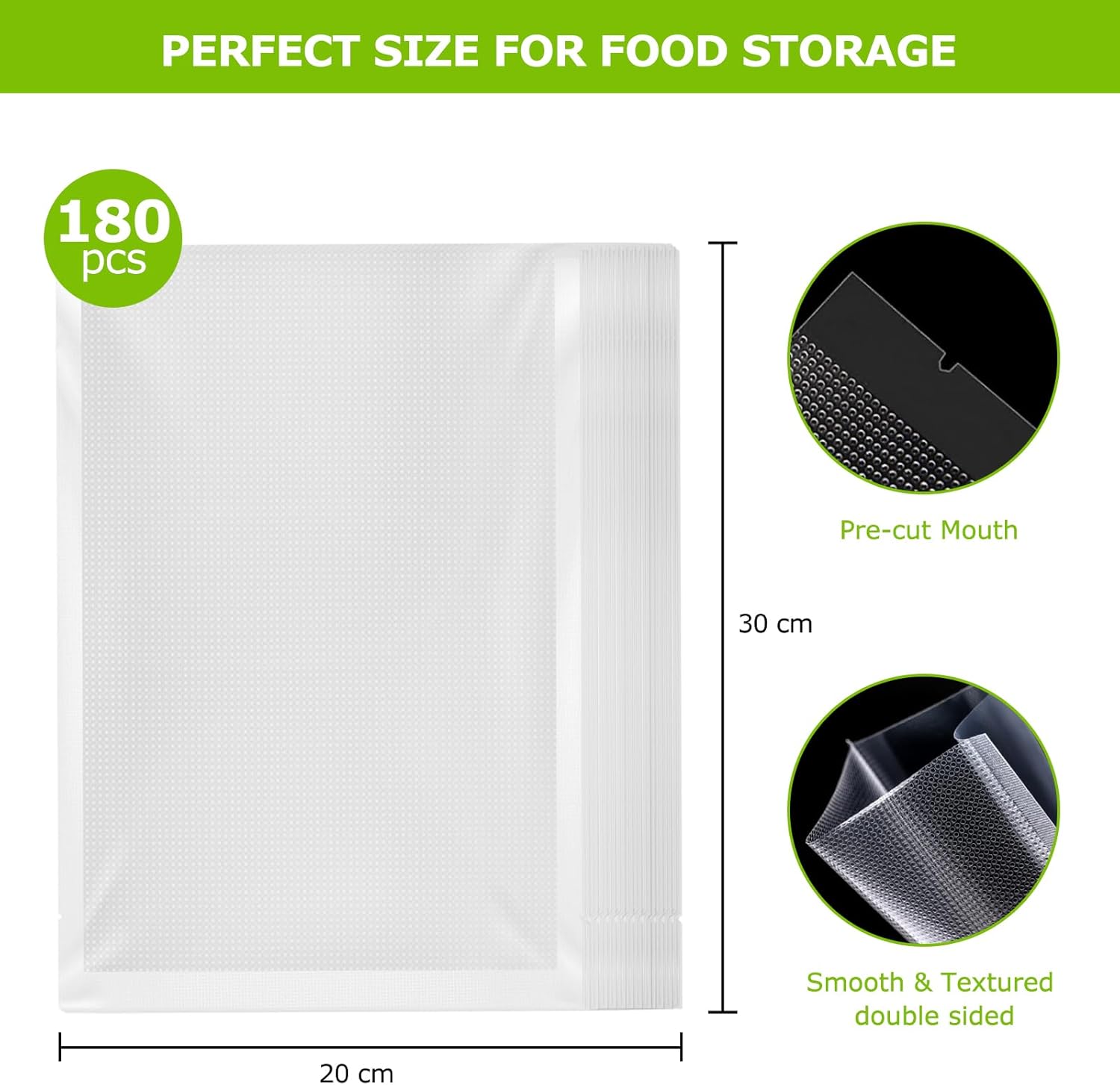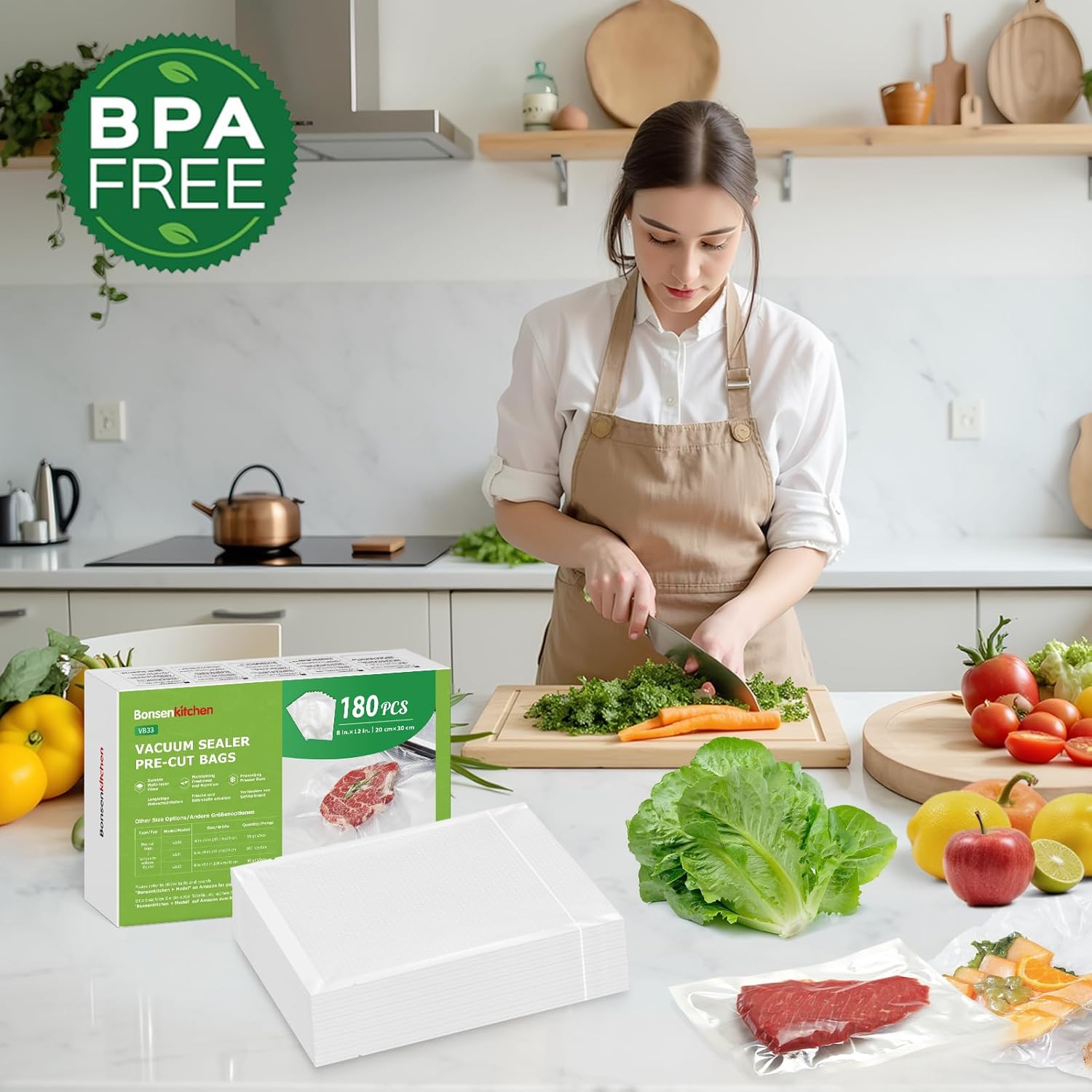 Bonsenkitchen Professional Vacuum Sealer Bags, 180 Pcs 20 x 30 cm Vacuum Sealer Bags for All Vacuum Sealer & Food Vacuum Sealer Devices, Boil-Proof and Sous Vide Freezer Bags, BPA-Free, VB33