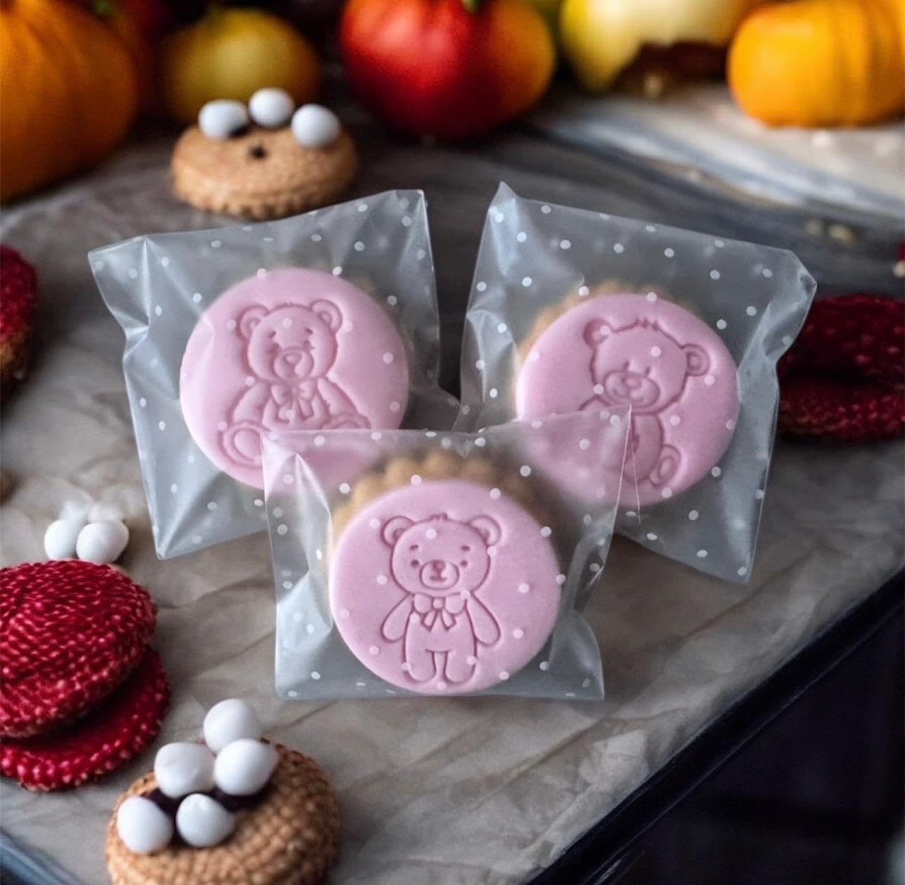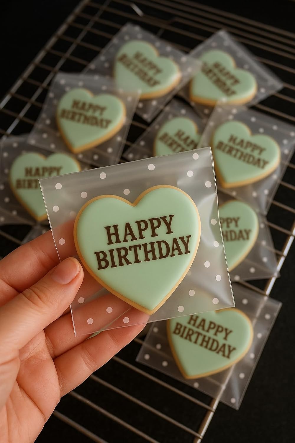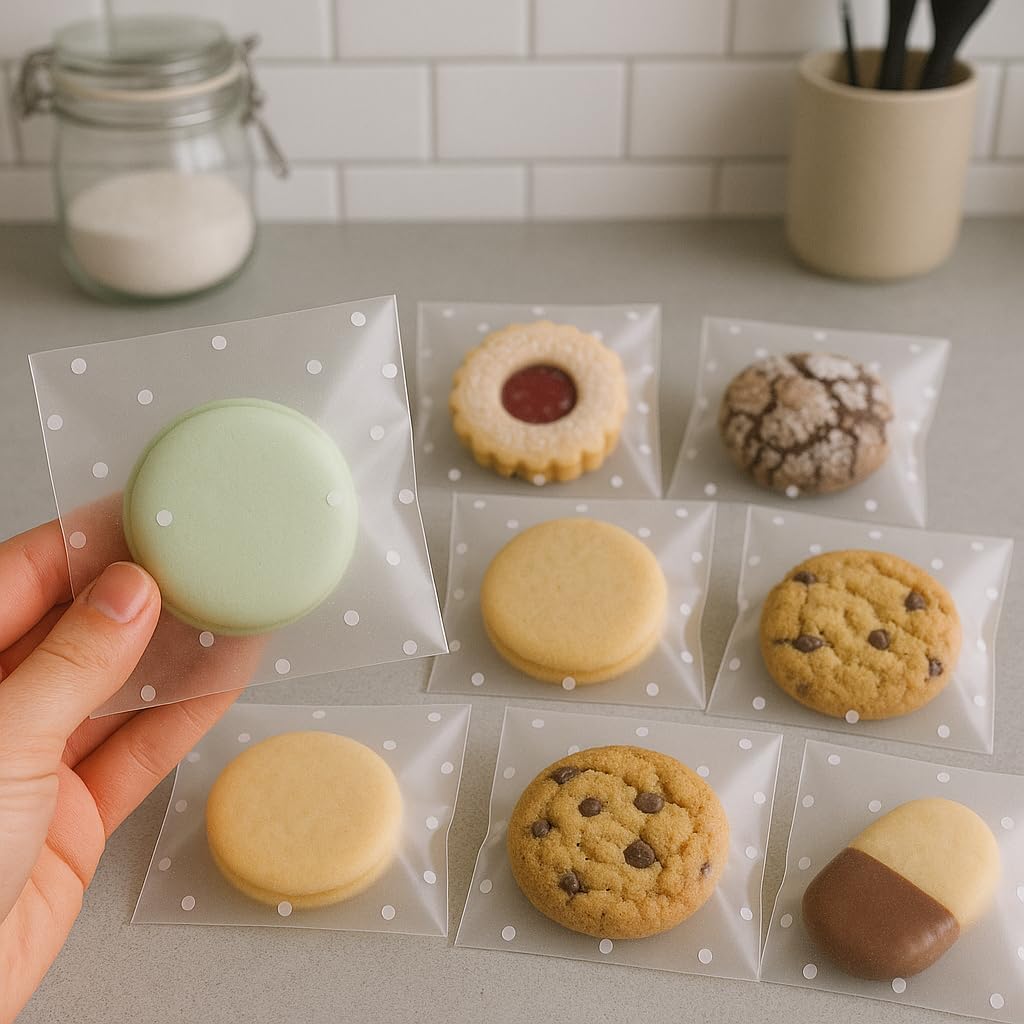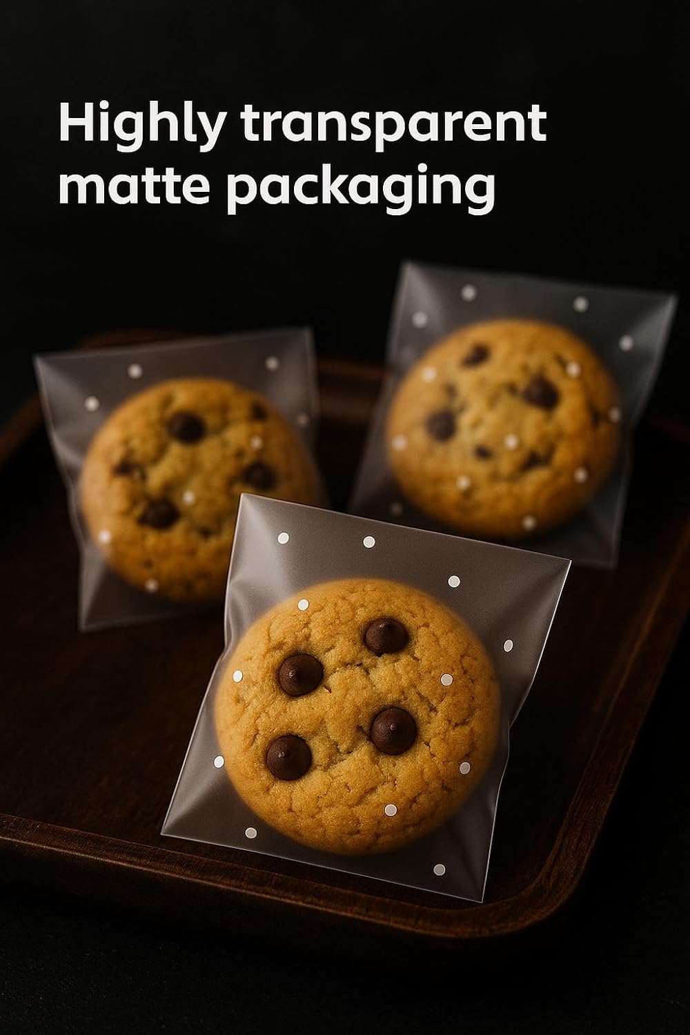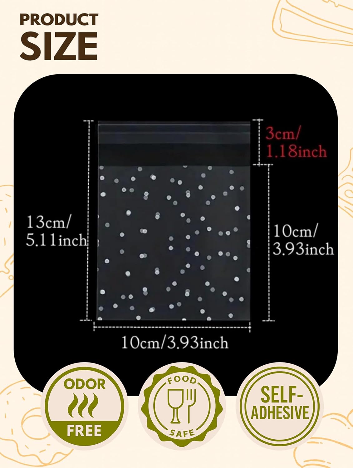 Cellophane Bags Pack of 100 (10x10cm) White Polka Dot Self-Seal Translucent Cookie Bags for Sweets, Chocolates, Candy And Biscuits