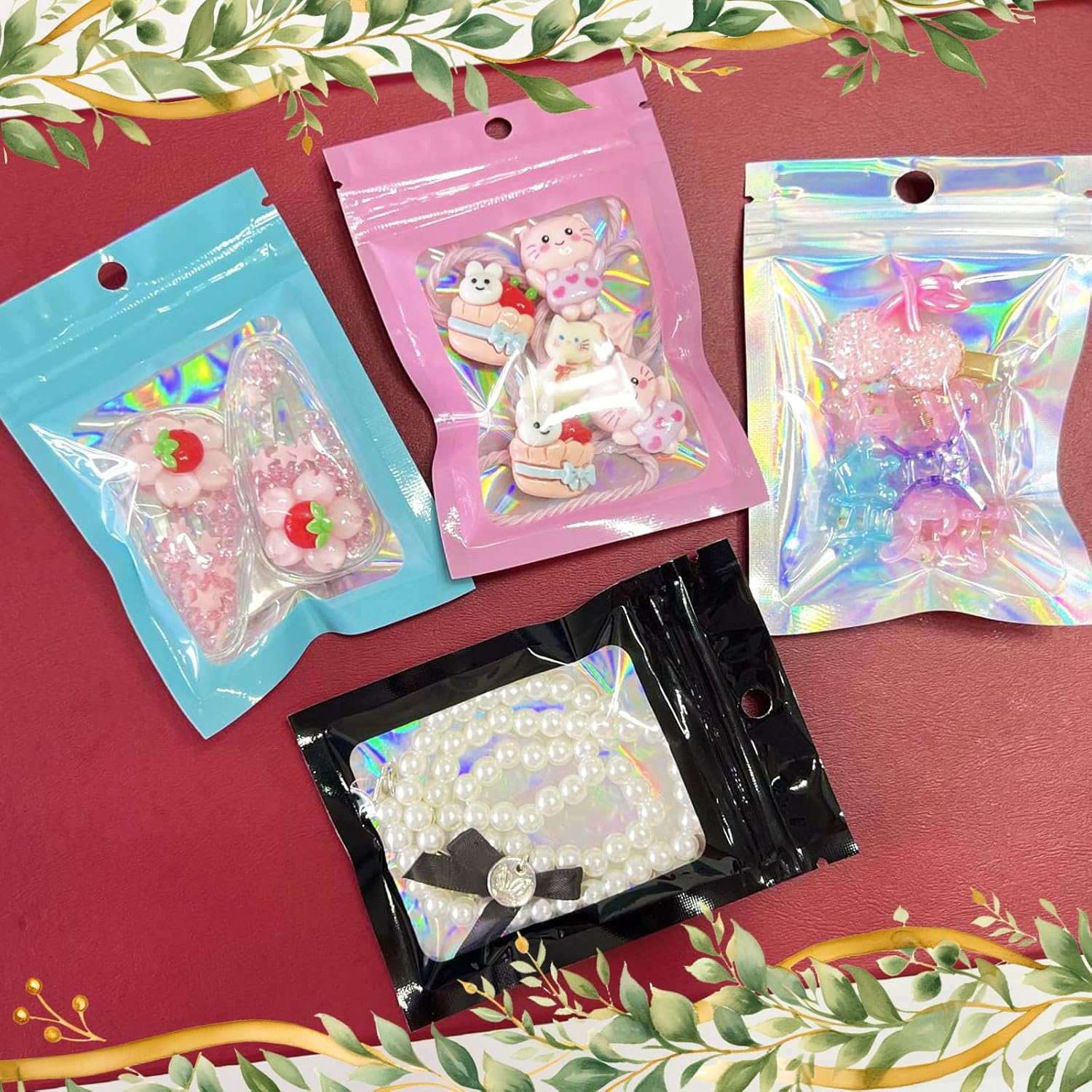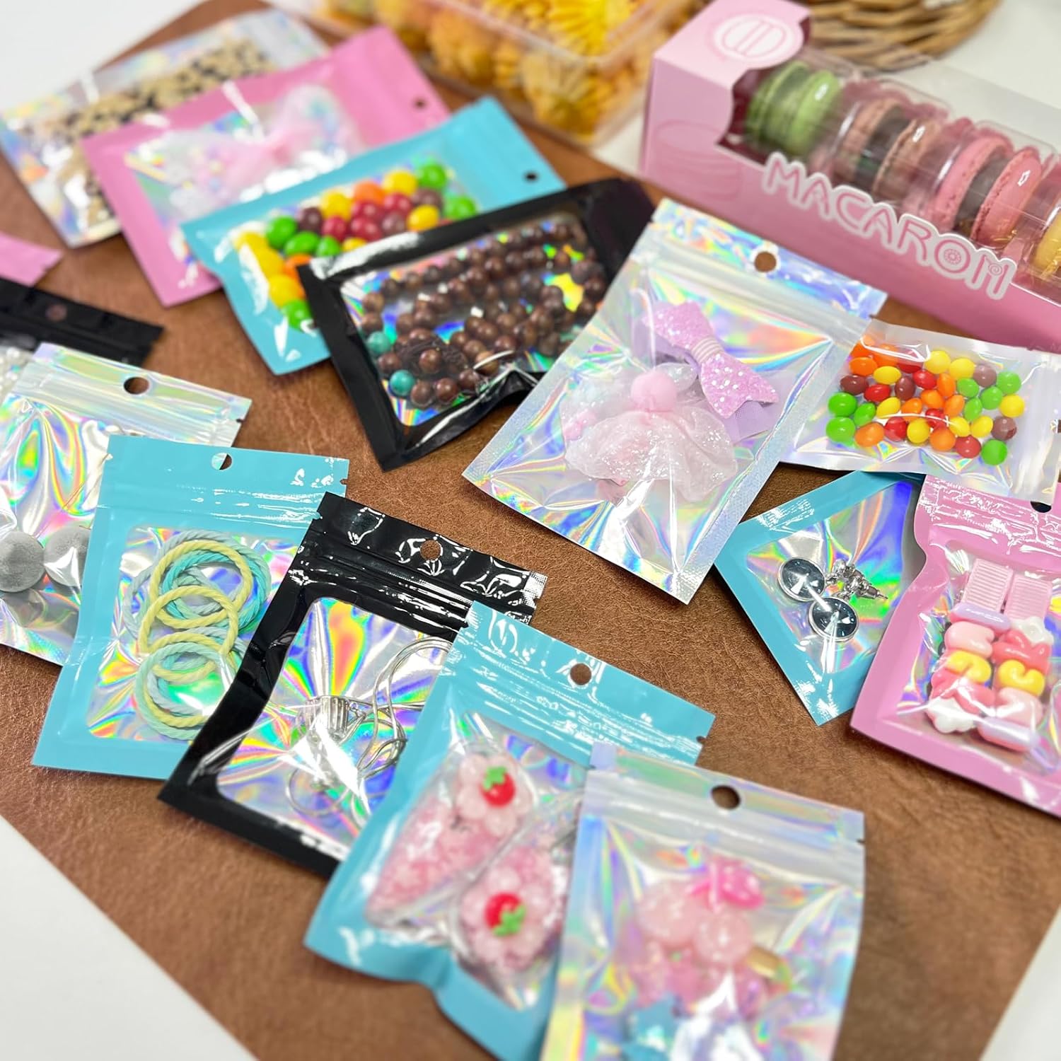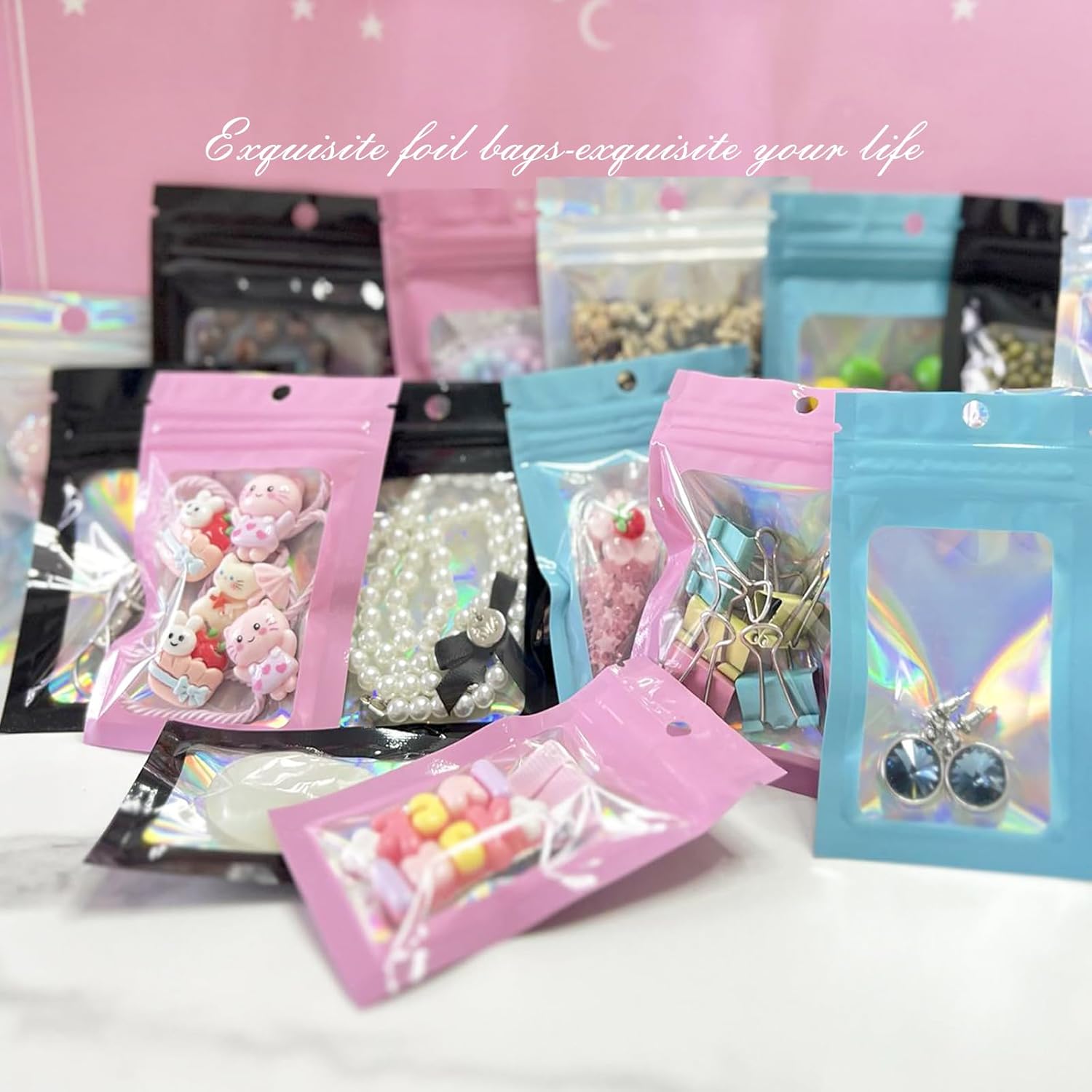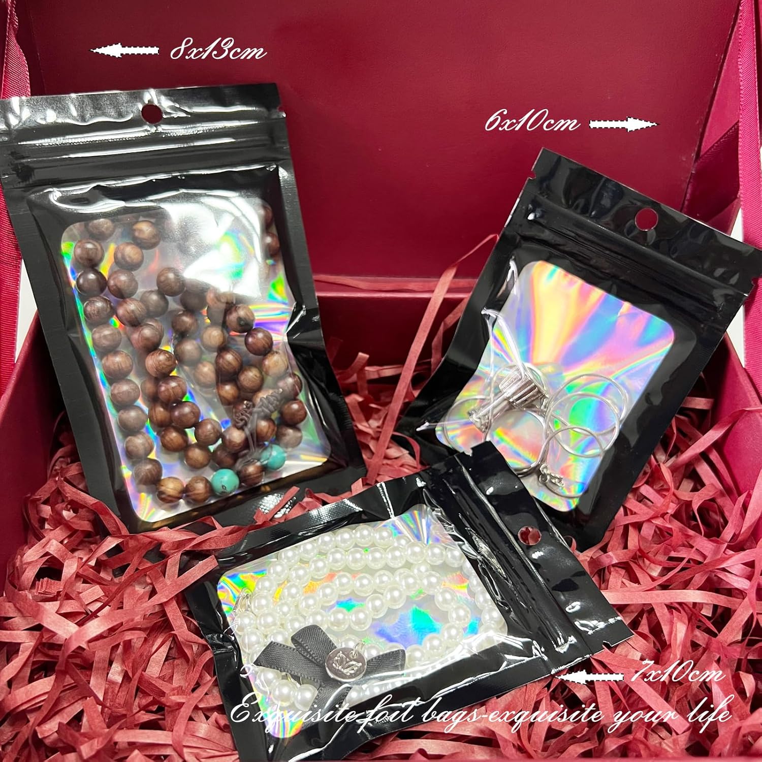 The FUNTOOB Mylar Bags are perfect for various packaging needs. These black holographic foil sealed bags measure 8 x 13 cm and come in a pack of 100. They are resealable, making them ideal for storing cookies, jewelry, or small gifts. The shiny finish adds a touch of elegance to your packaging, suitable for parties and home decorations.