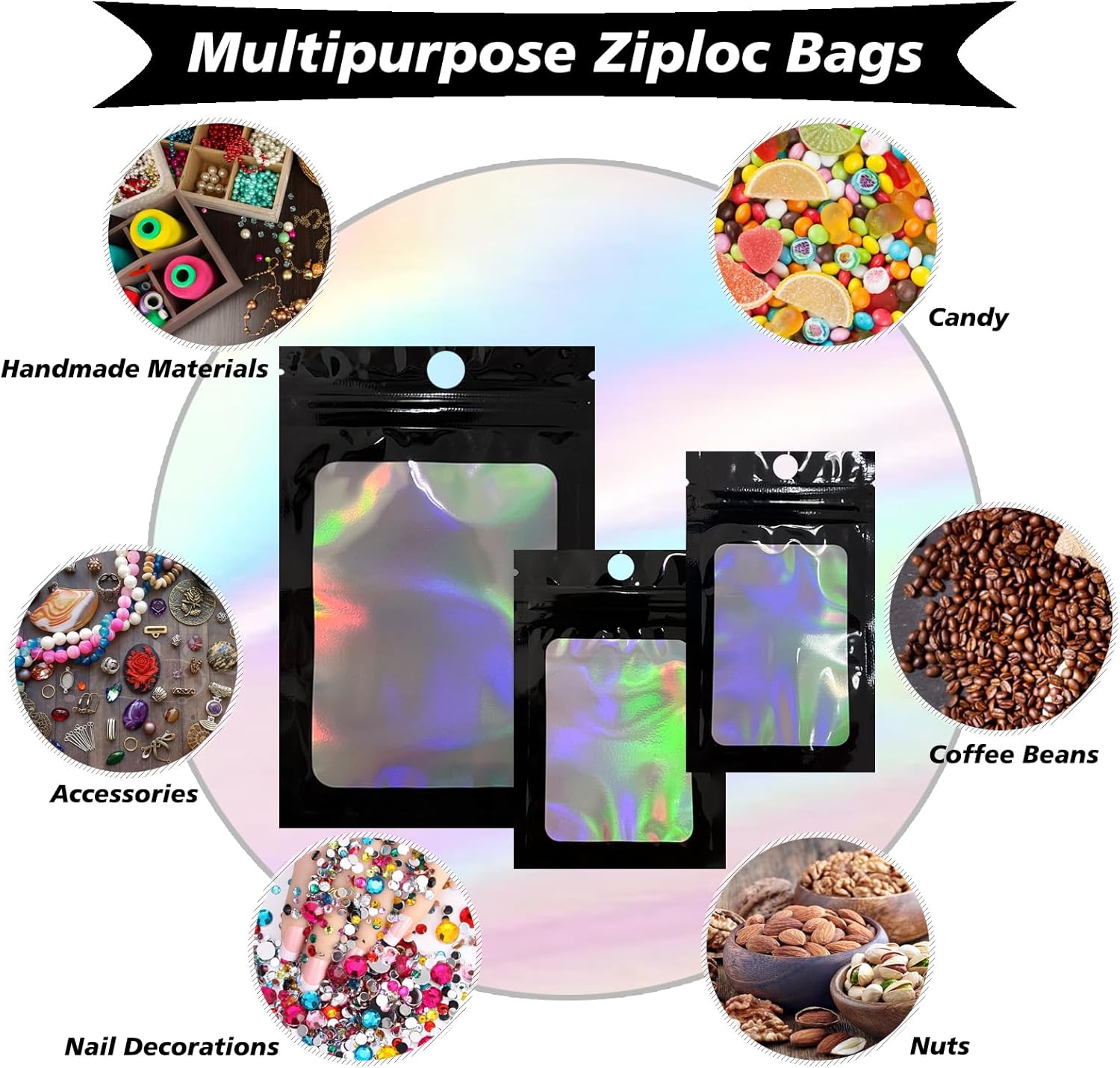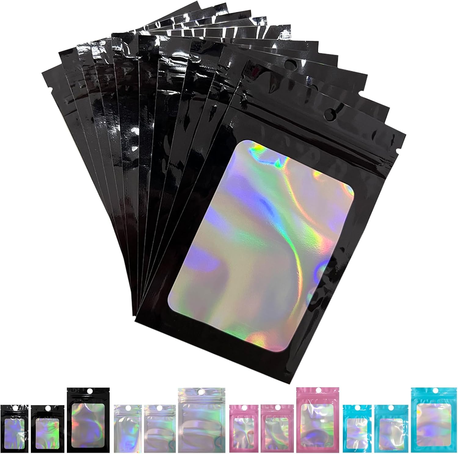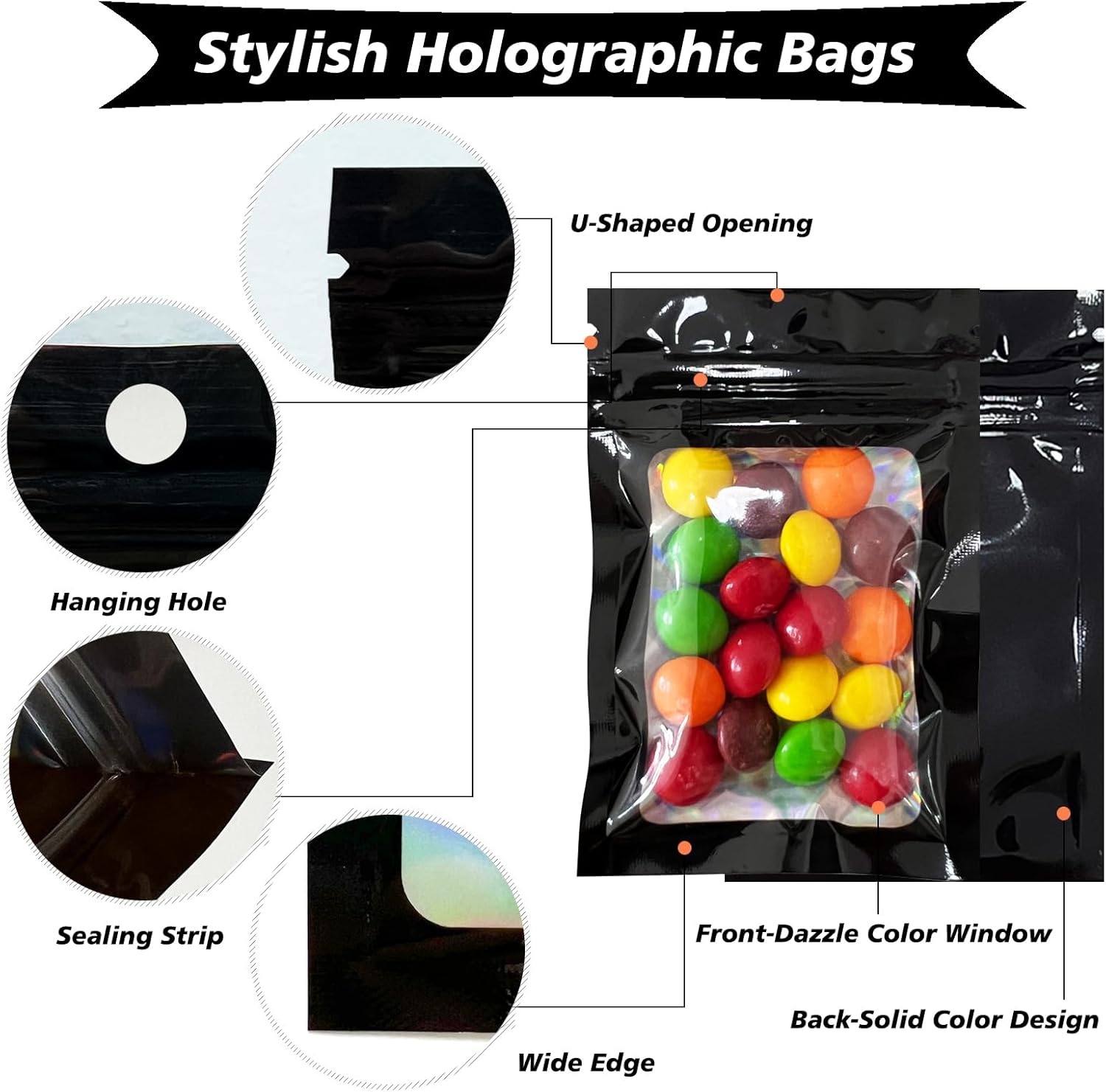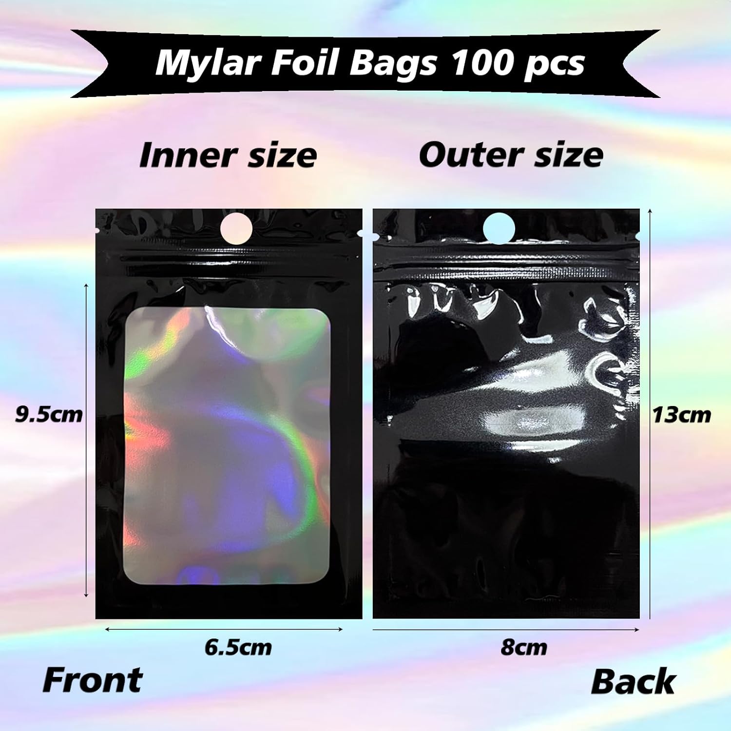 FUNTOOB Mylar Bags 100Pcs Black Holographic Foil Sealed Bags Resealable Pouches Little Small Bag Sweet Pouches Sample Bag for Cookies Jewellery Gift Packaging (8 x 13cm)