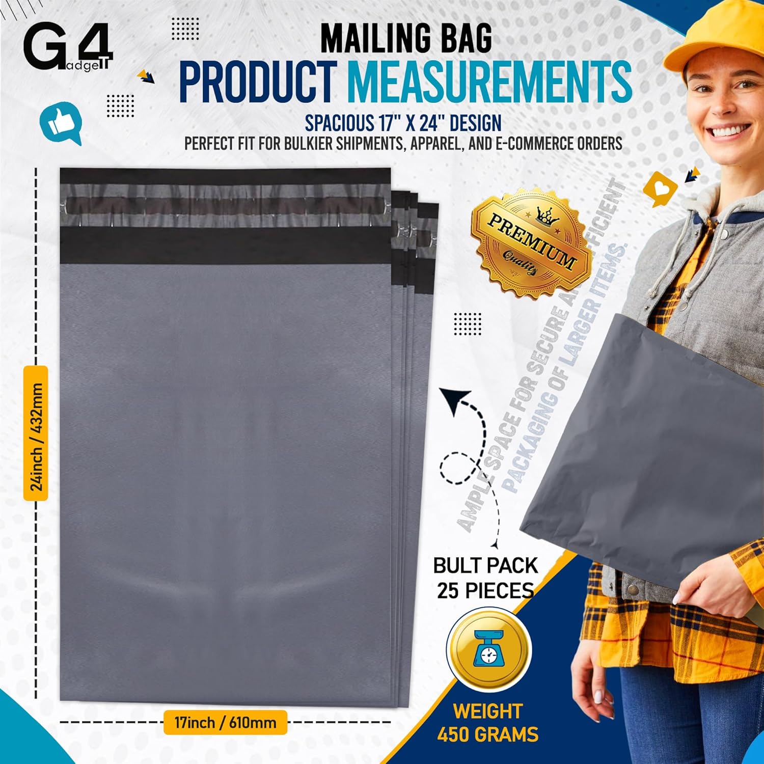 G4GADGET 25 Pack Large Grey Mailing Bags 17×24 [432mm x 610mm] – Strong Postage Bags for Clothes, Vinted Shipping, Parcel Packaging, Delivery, Mailing & Posting