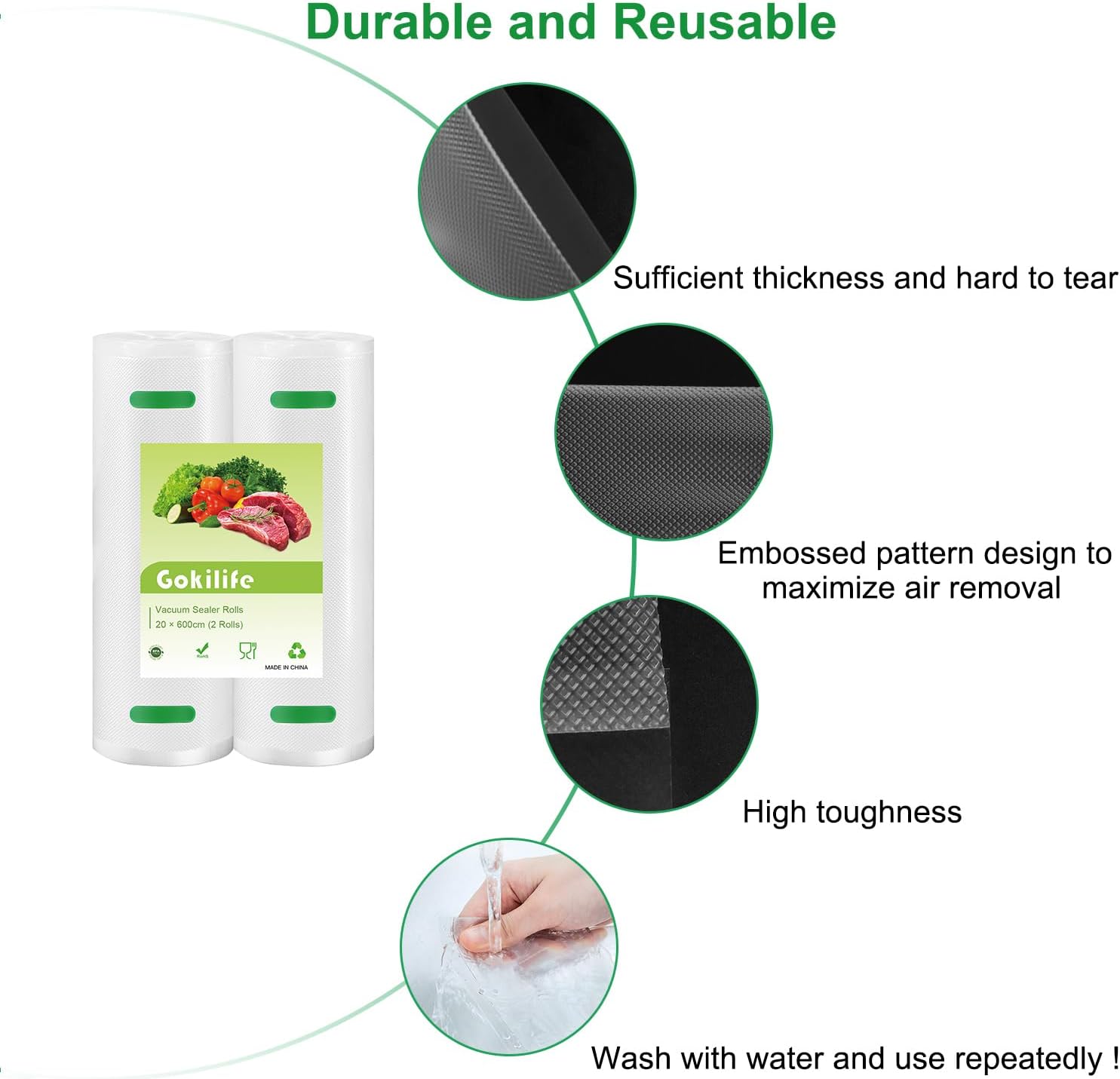 Gokilife Vacuum Sealer Bags Rolls – 2 Rolls 20 x 600 cm Sous Vide Bags, BPA Free, Durable Commercial Customized Size Food Bags for Food Storage and Sous Vide Cooking