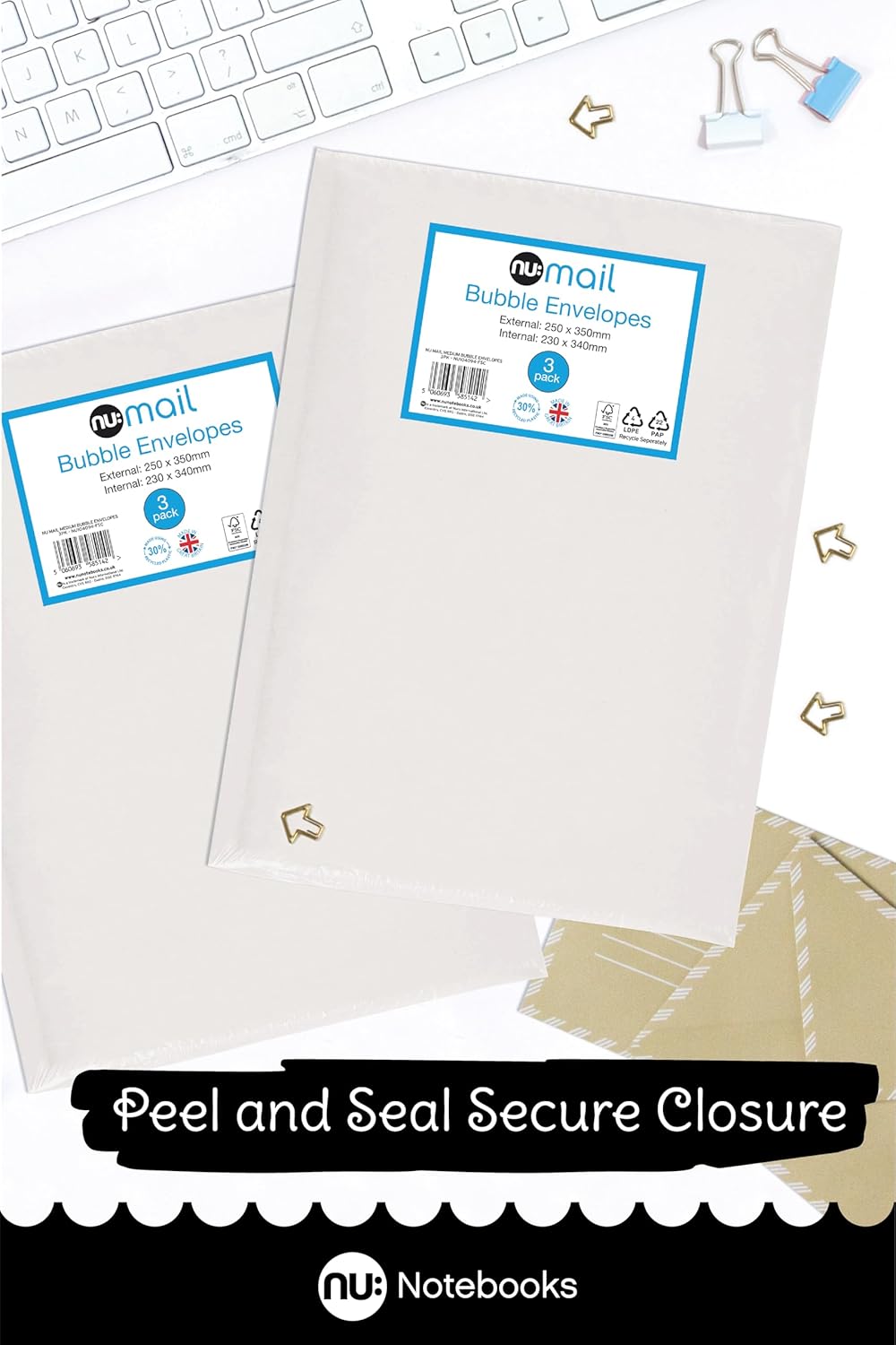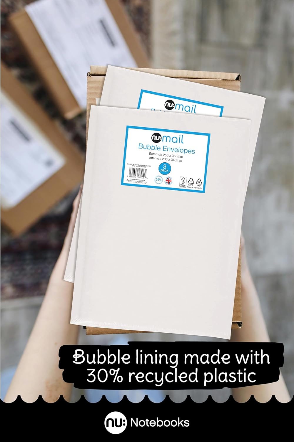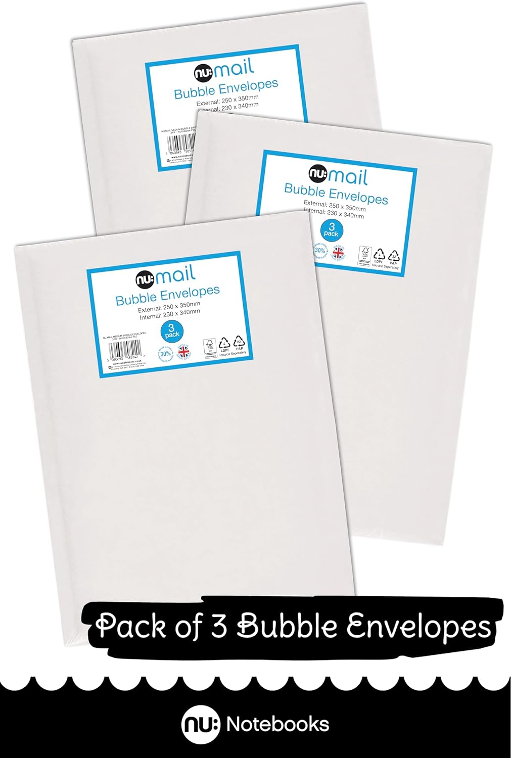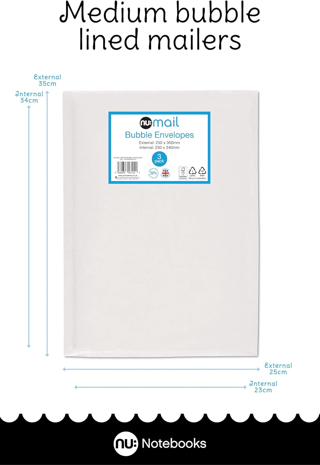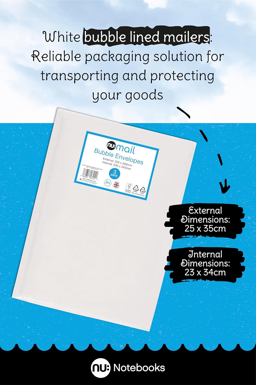 The nu: Mail Padded Bubble Envelope Medium offers an eco-friendly solution for shipping and moving fragile items. Each pack contains three envelopes, measuring 23 x 34 cm usable size and 25 x 35 cm outside size, ensuring ample space for your goods. Made from recyclable LDPE material, these envelopes can be returned to supermarket recycling points, contributing to sustainability efforts.