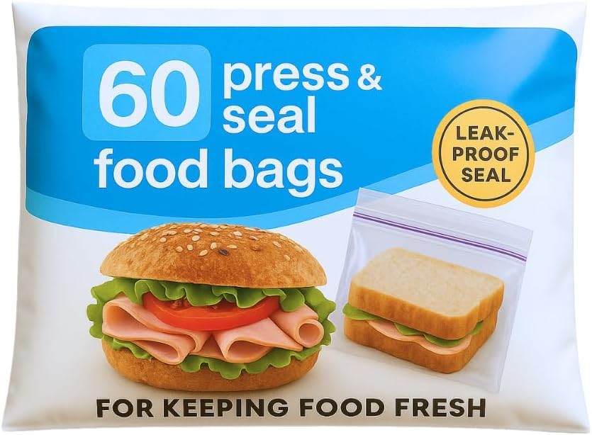 Sandwich Bags 1 Pack Of 60 Press And Seal Food Bags, Re-sealable Tab Closure For Food And Snacks(17cm x 20.cm Approx.) Perfect for Storing Snacks, Fresher for Longer