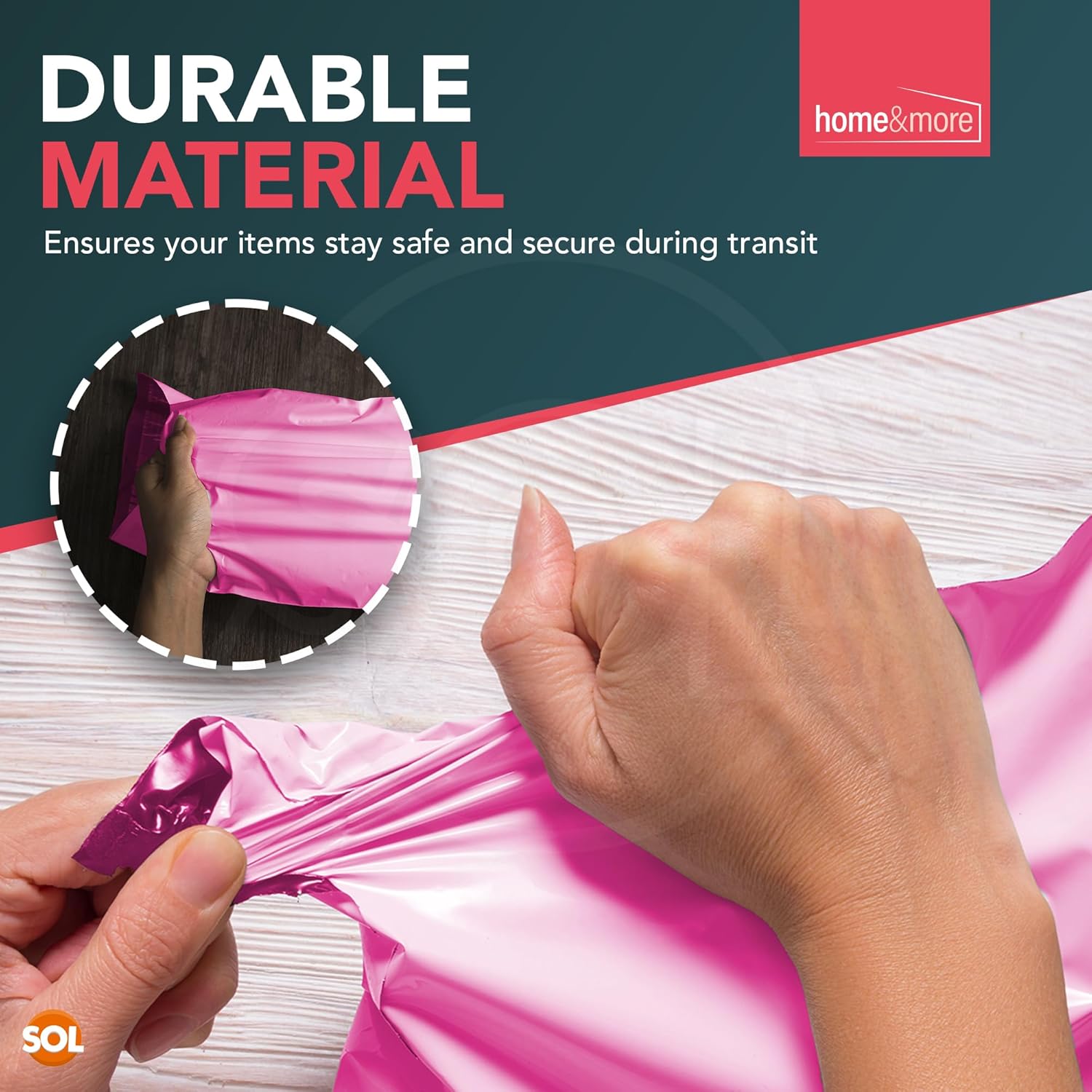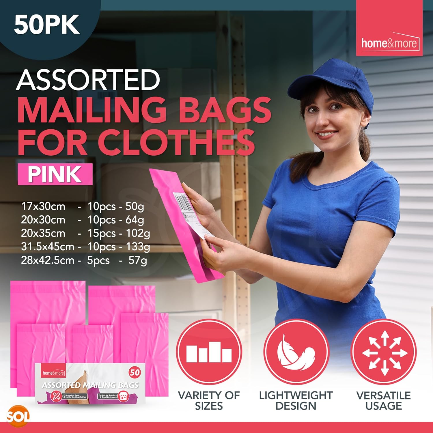The SOL 50pk Pink Assorted Mailing Bags are designed for a variety of shipping needs. These self-seal bags are perfect for sending clothes, shoes, documents, and gifts. Made from durable materials, they ensure your items are well-protected during transit. Their vibrant pink color adds a fun touch to your packages.