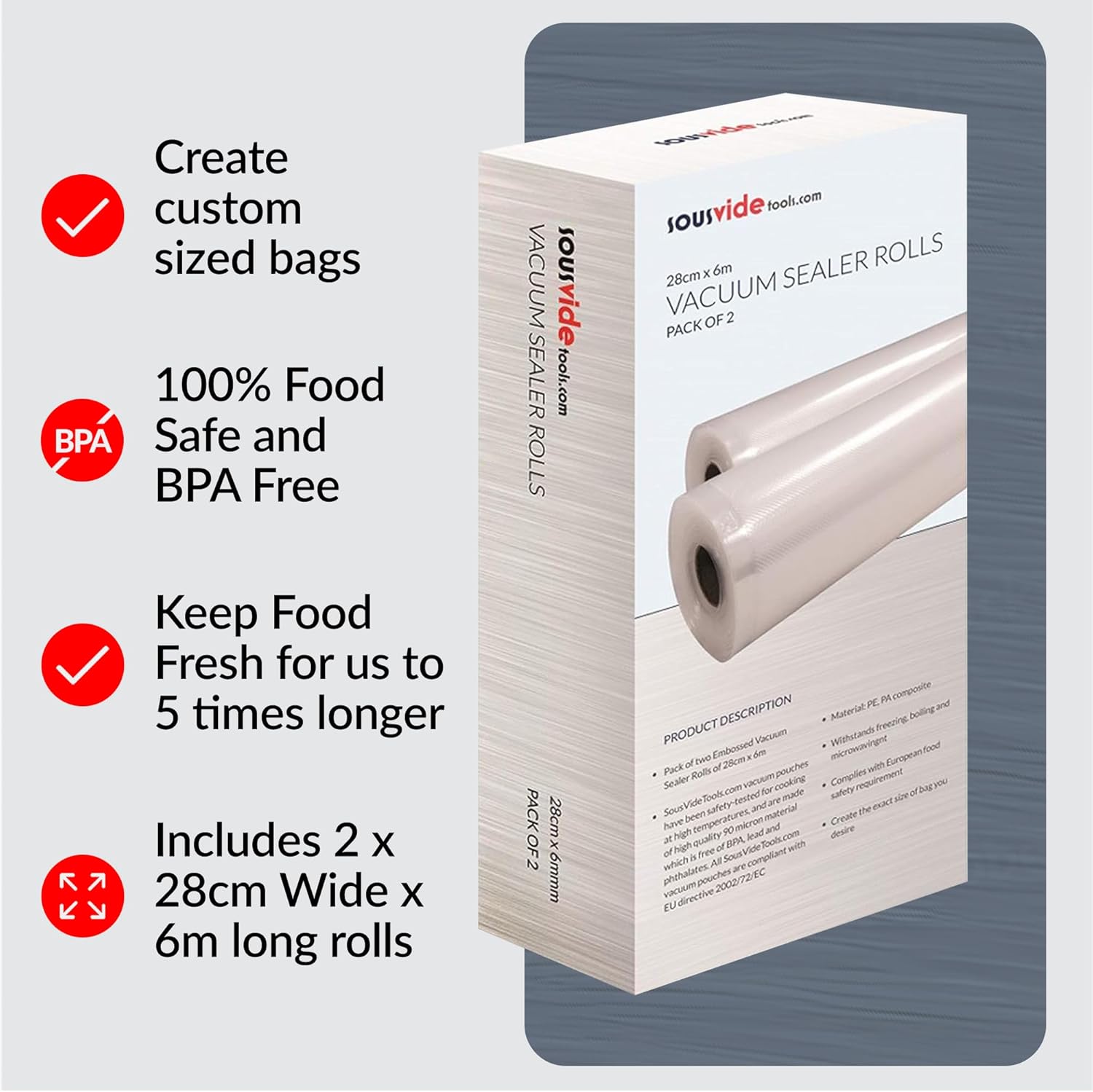 SousVideTools | Vacuum Sealer Rolls Pack of 2 | 28 cm x 6 m | Embossed Plastic Food Storage | Sous Vide Cooking, Boiling, Freezing and Microwaving – Packaging May Vary