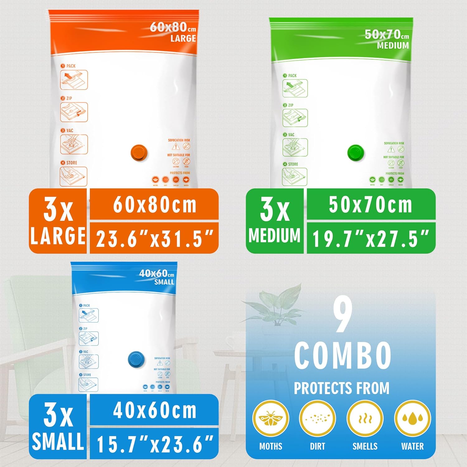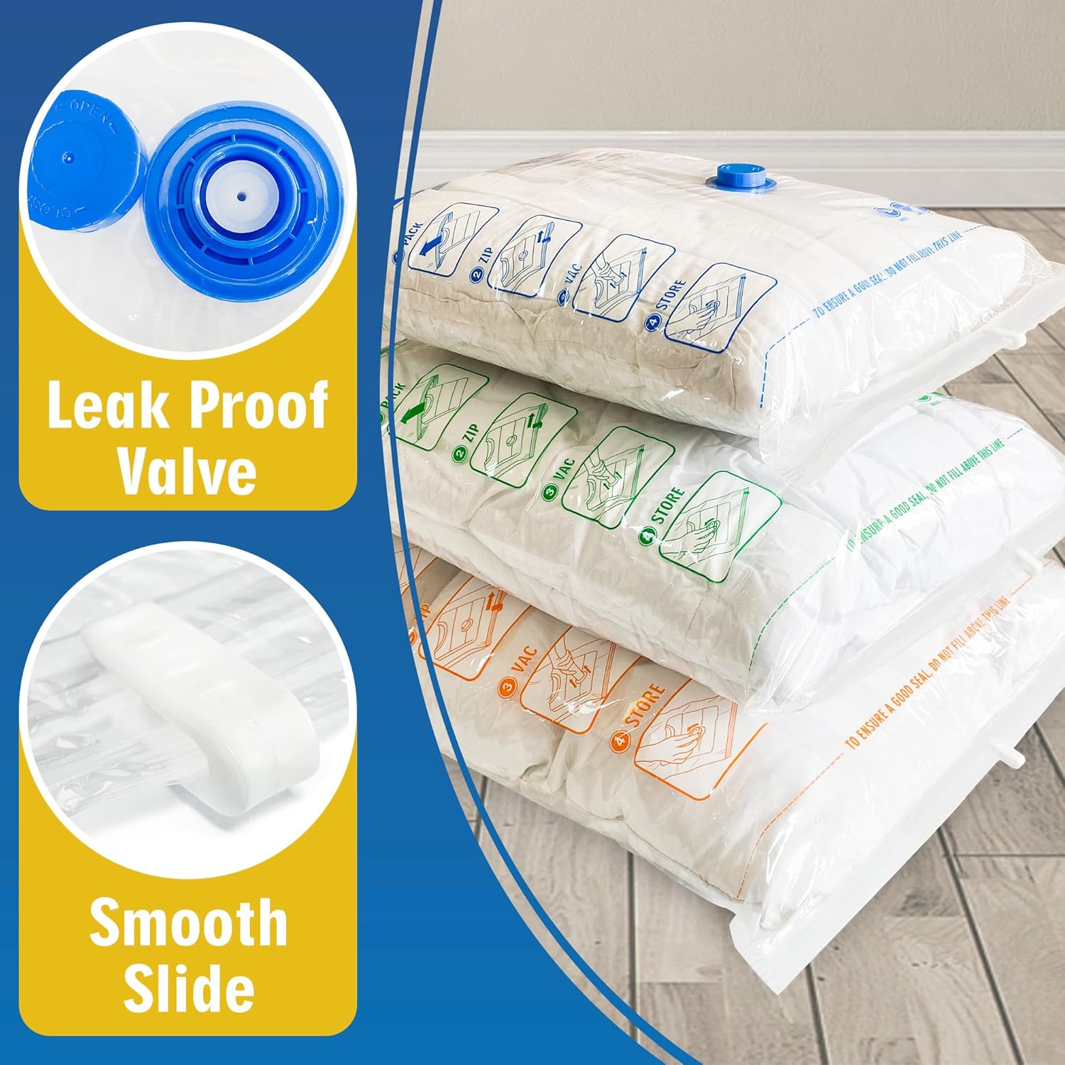 Storage Master Space Saver Bags are designed to help you save valuable space in your home or during travel. These reusable vacuum storage bags can compress bulky items like clothing, bedding, and towels, allowing you to create up to 80% more storage space. They are especially useful when swapping out seasonal clothing or when moving. The vacuum sealer bags keep your items protected from moisture and dust, ensuring they remain in good condition over time.
