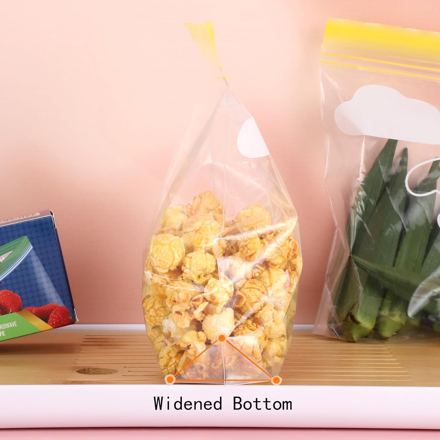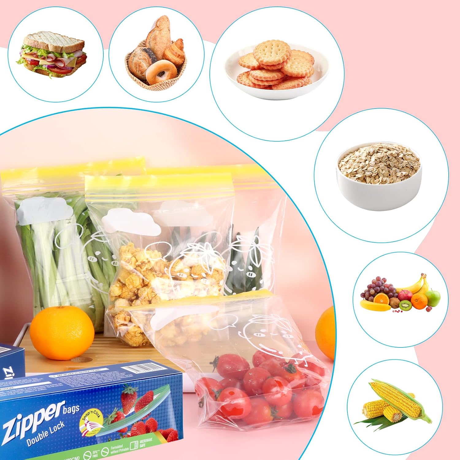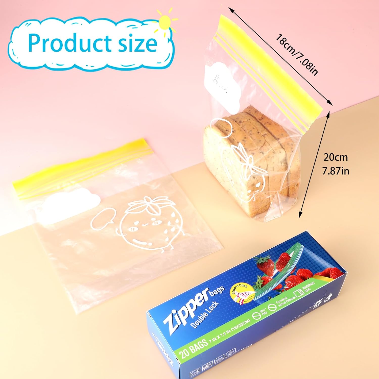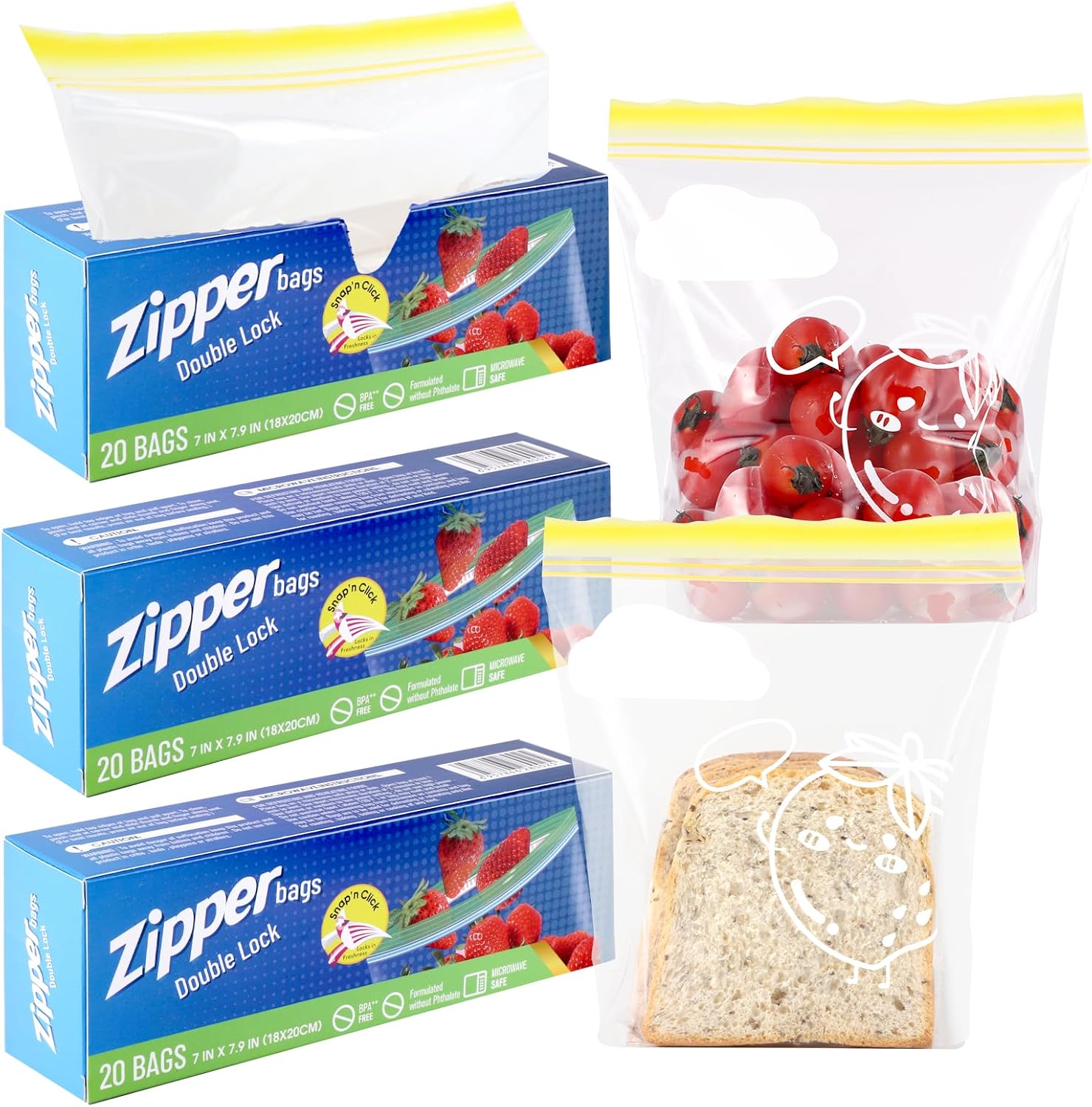 The Yoosso 60Pcs Sandwich Bags are designed for versatile food storage. These medium zip lock bags measure 20.5 x 18 cm (8.1 x 7.09 inches) and come in three boxes with 20 bags each, totaling 60 bags. They are ideal for storing snacks, fruits, and other food items, helping you keep your kitchen organized. The double zipper structure ensures a leak-proof seal, effectively isolating air to maintain freshness.